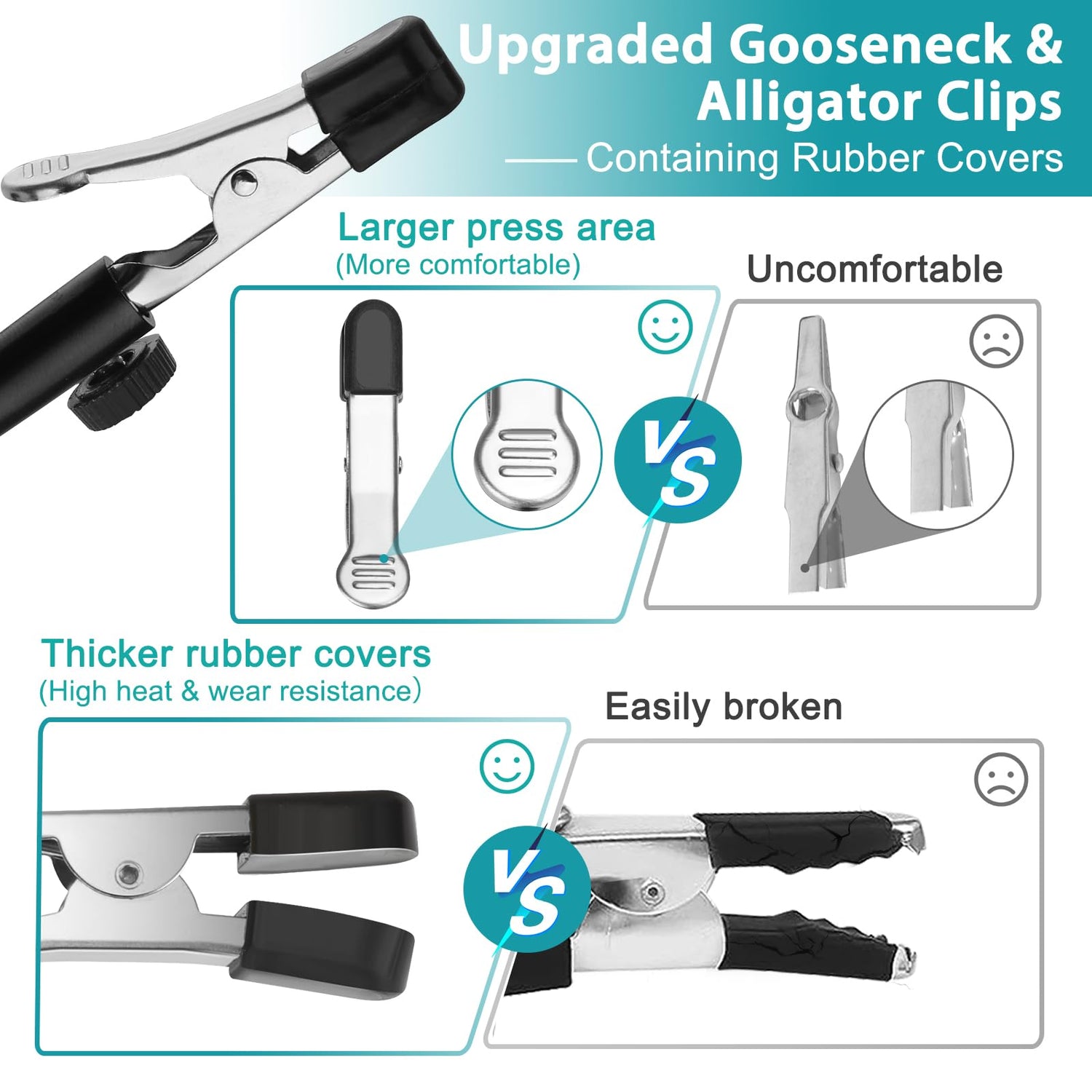 - Upgraded Alligator Soldering Clip: The alligator clip is fixed on the gooseneck assistant by screws, which can be rotated 360°for a tight hold. The pressing area of the alligator clip is widened to fit the size of the human thumb, making it more comfortable to use. Each clip comes with a detachable rubber cover. Unlike other products, our rubber cover is thicker and more heat-resistant, not easy to wear and tear, and can better protect the circuit board from being scratched.