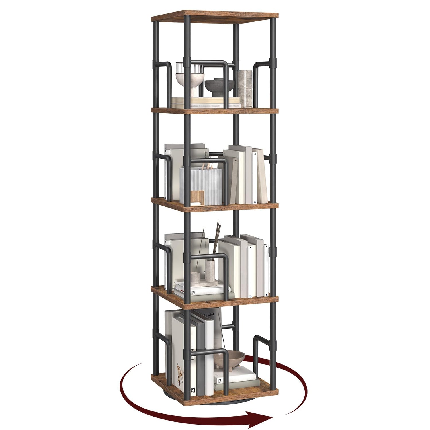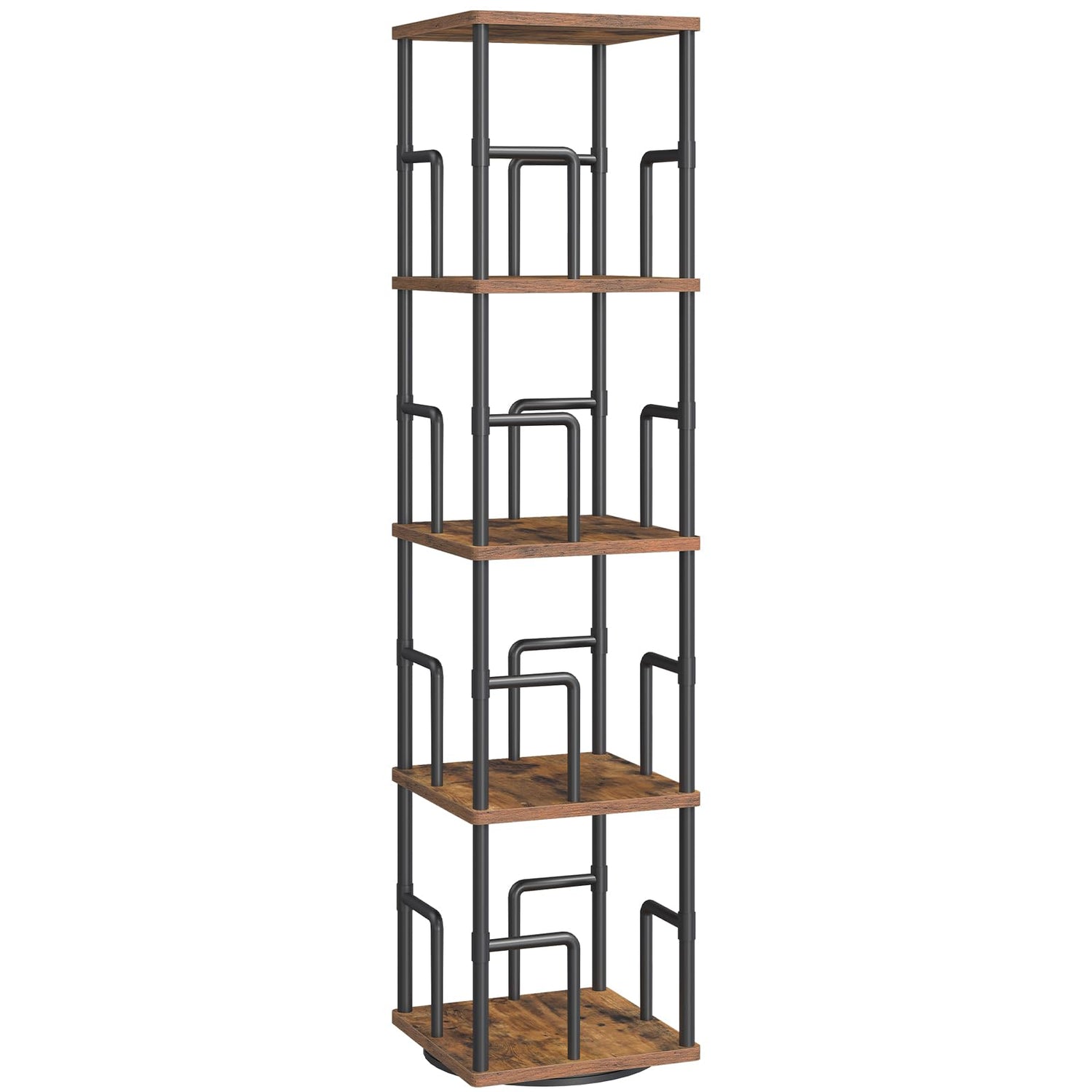 MAHANCRIS 4-Tier Rotating Bookshelf, Freestanding Corner Bookshelf, 360° Spinning Bookcase, Industrial Style Storage Rack with Rails, for Living Room, Bedroom, Study, Rustic Brown and Black BKHR1501