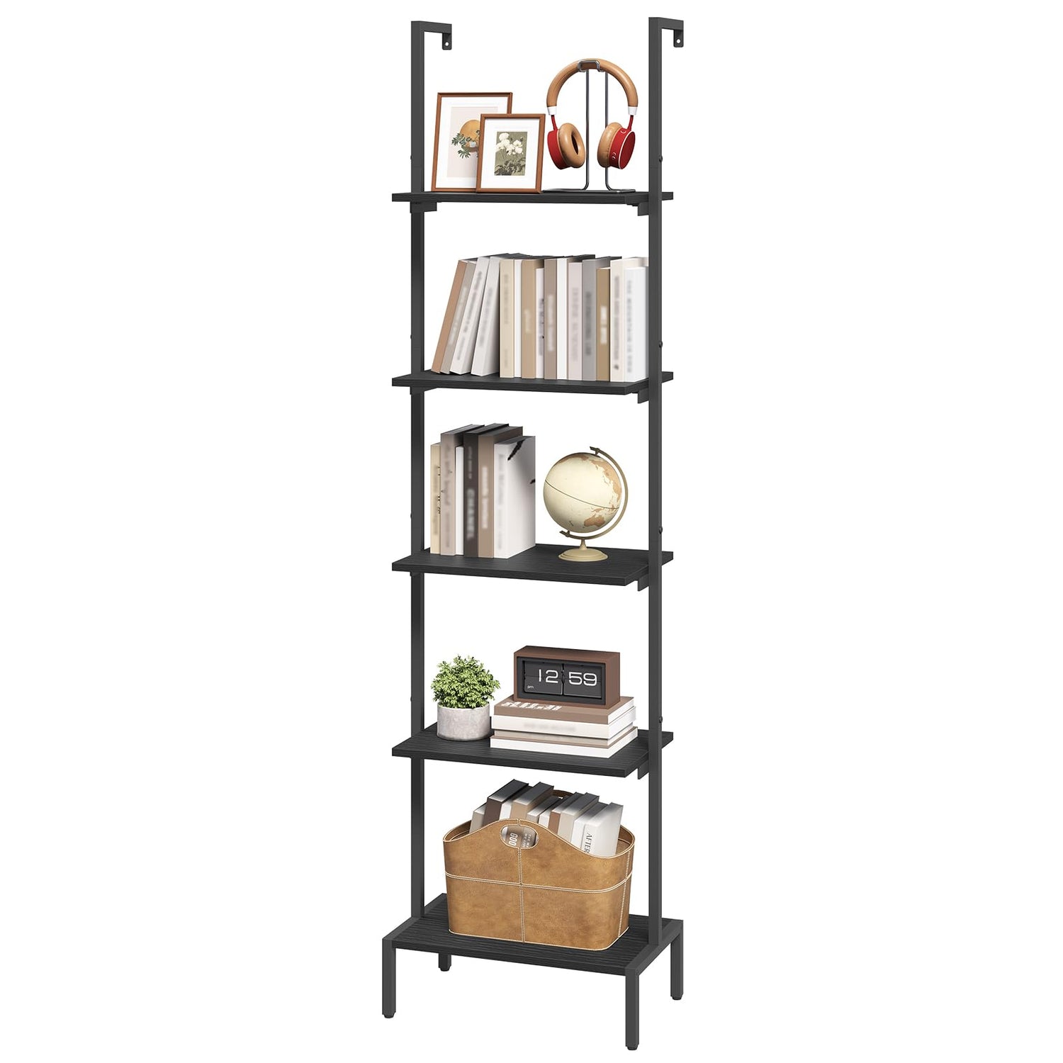 MAHANCRIS 5-Tier Ladder Shelf, Storage Bookshelf with Wall Mount, Heavy Duty Industrial Style Ladder Shelves for Living Room, Office, Kitchen, Bedroom, Black LSBK5501