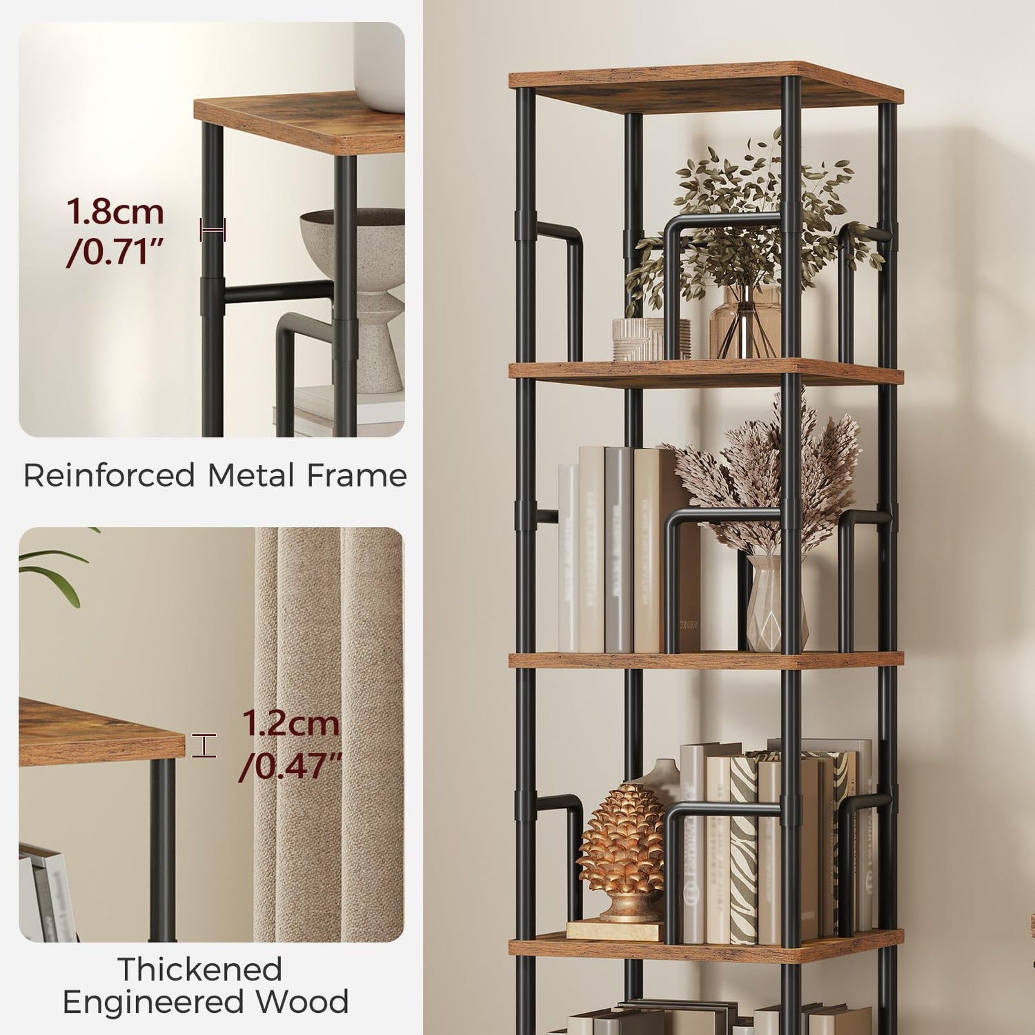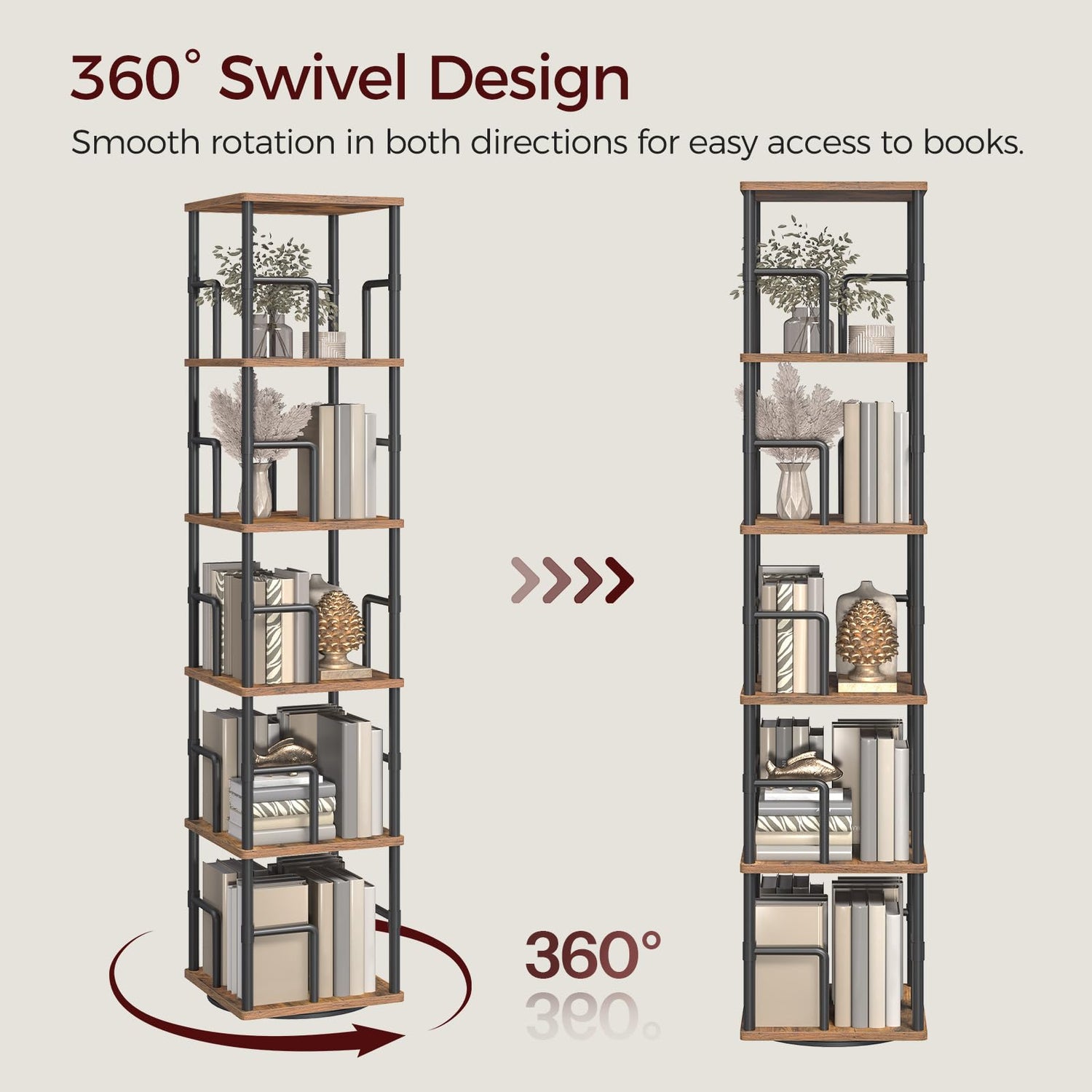 MAHANCRIS 5-Tier Rotating Bookshelf, Freestanding Corner Bookshelf, 360° Spinning Bookcase, Industrial Style Storage Rack with Rails, for Living Room, Bedroom, Study, Rustic Brown and Black BKHR1601