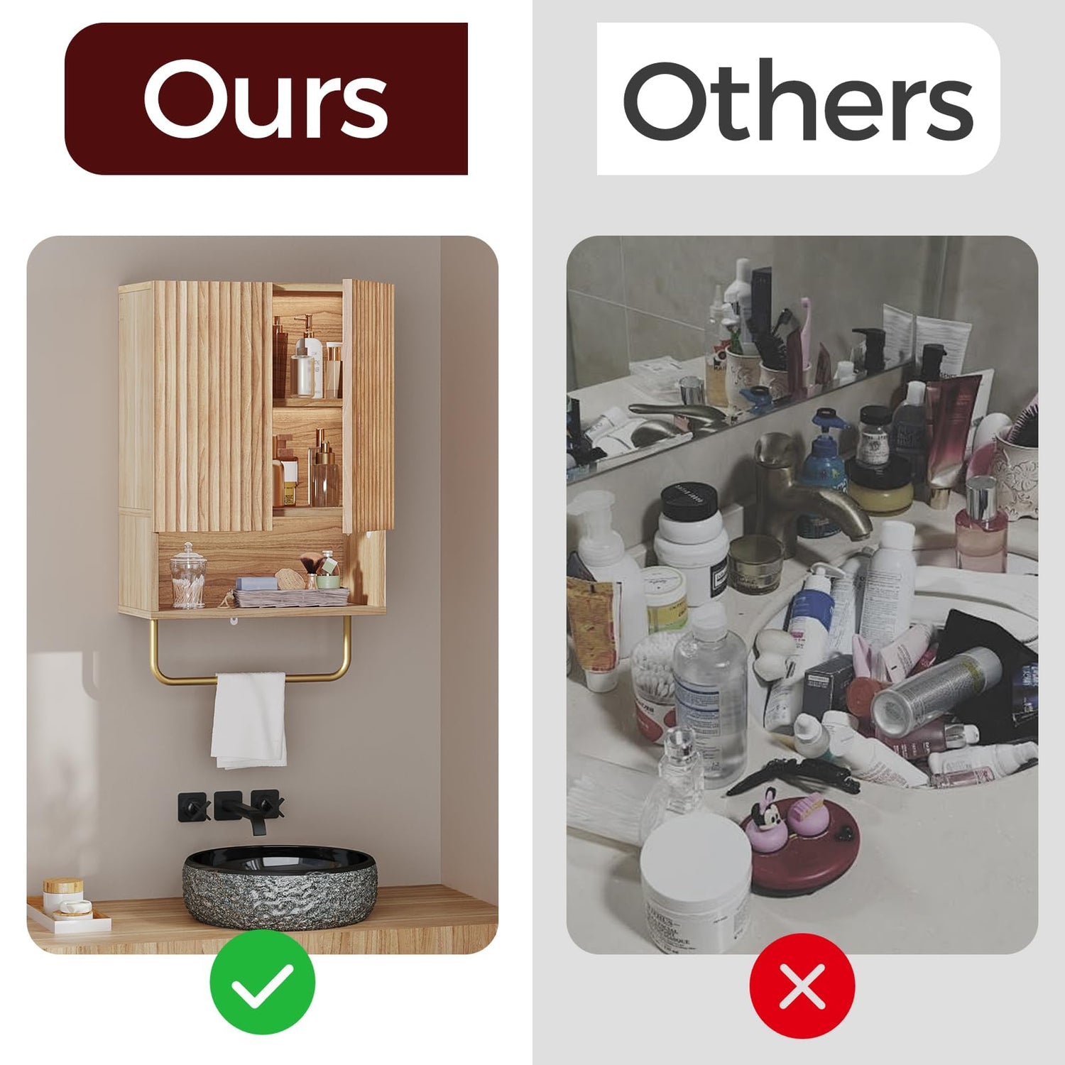 MAHANCRIS Bathroom Wall Cabinet, Wall Mounted Medicine Cabinets with Towel Bar & Adjustable Shelf, Over The Toilet Space Saver Storage Cabinet with 2 Doors, for Bathroom Laundry Room Kitchen, Natural