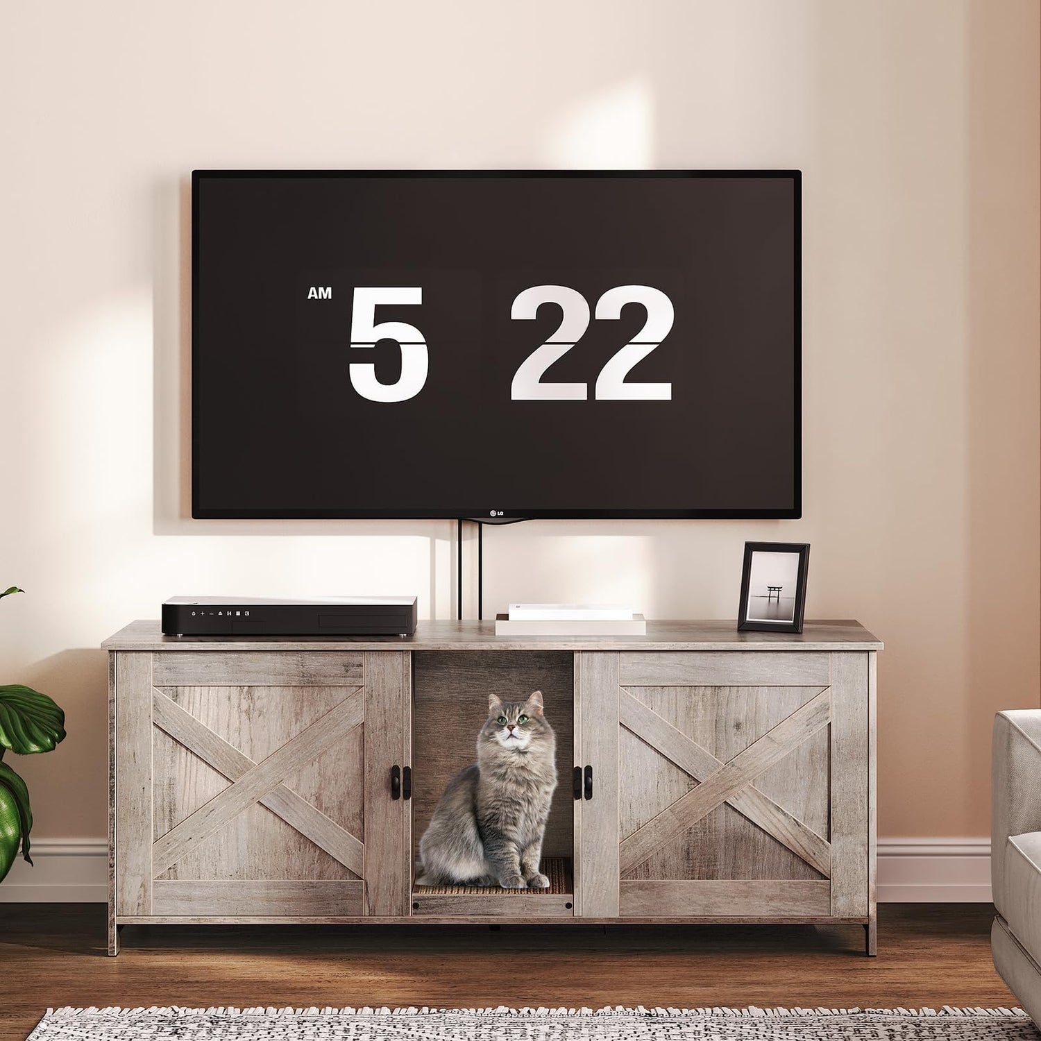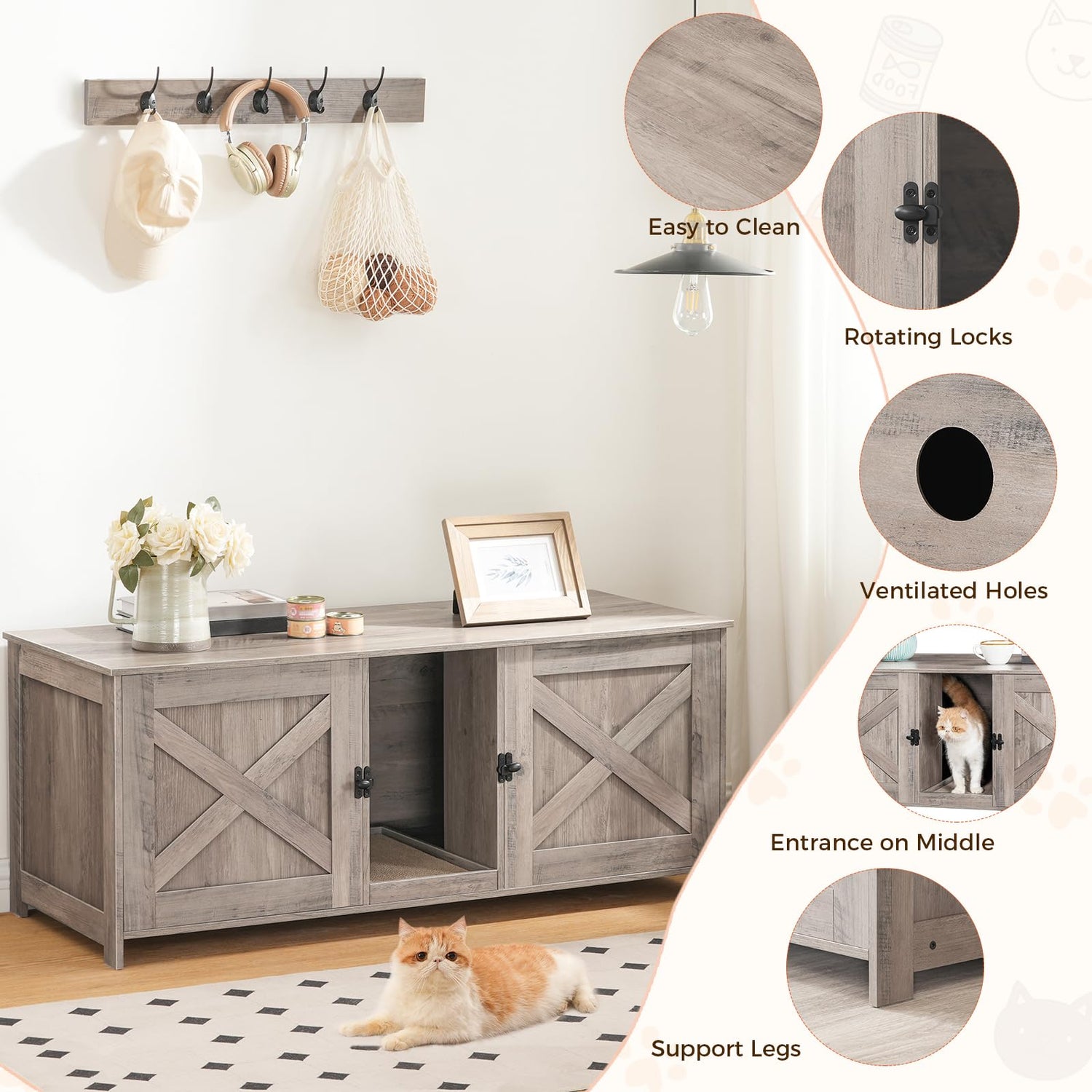 MAHANCRIS Cat Litter Box Enclosure for 2 Cats, 47.2" Hidden Cat Litter Box Furniture with Double Room, Wooden Cat Washroom Cabinet with Scratching Board, Indoor Cat House End Table, Greige CWHG1201