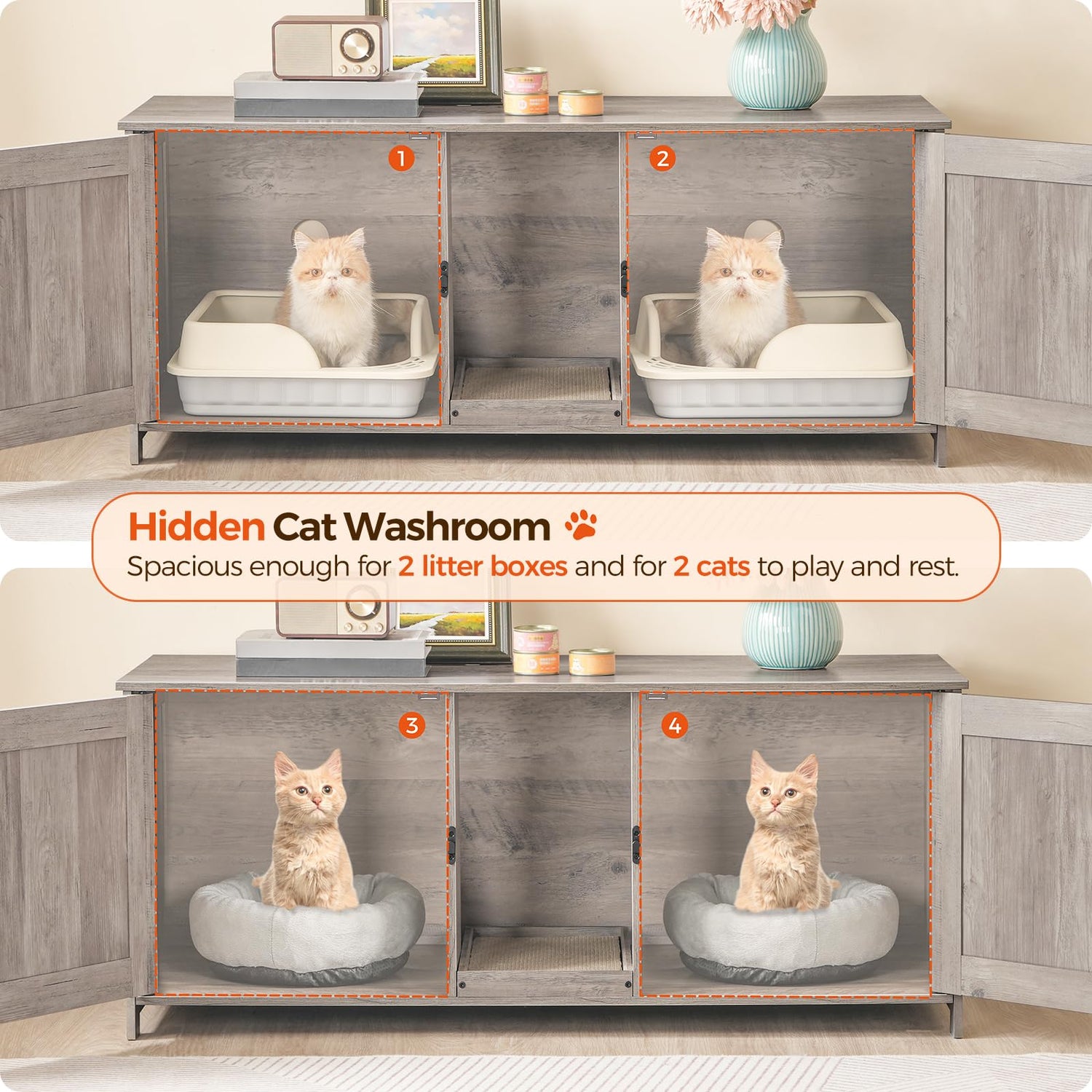 - Multiple Functions: This dual-door indoor cat house furniture includes 2 hidden rooms to be cat washroom and resting place at the same time. It can also serve as a home TV stand, storage cabinet, end table, nightstand, storage bench etc. Its retro design is suitable for any home styles