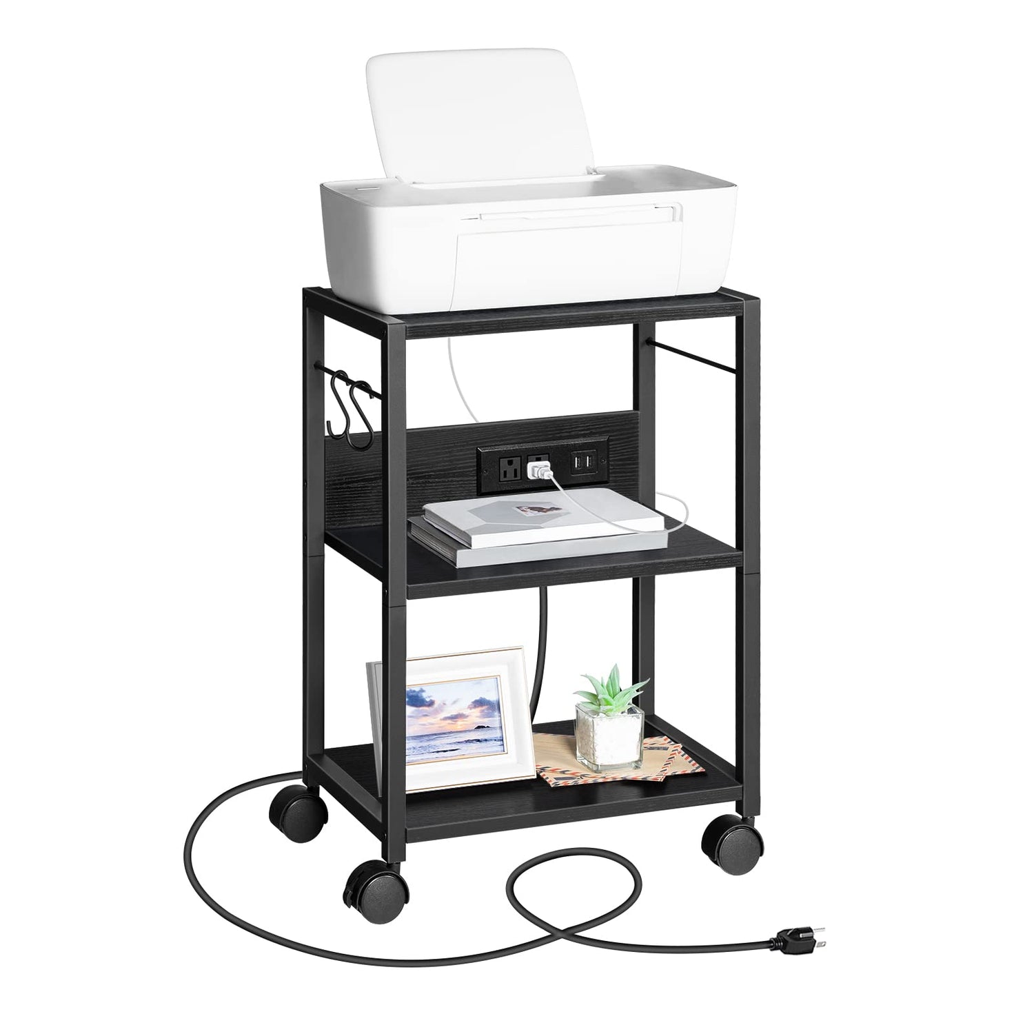 MAHANCRIS Industrial Printer Cart, 3-Tier Mobile Printer Stand, Rolling Cart with Power Outlets and USB Ports, Home Printer Stand with 2 Hooks, for Office, Living Room, Black PTHB40E01