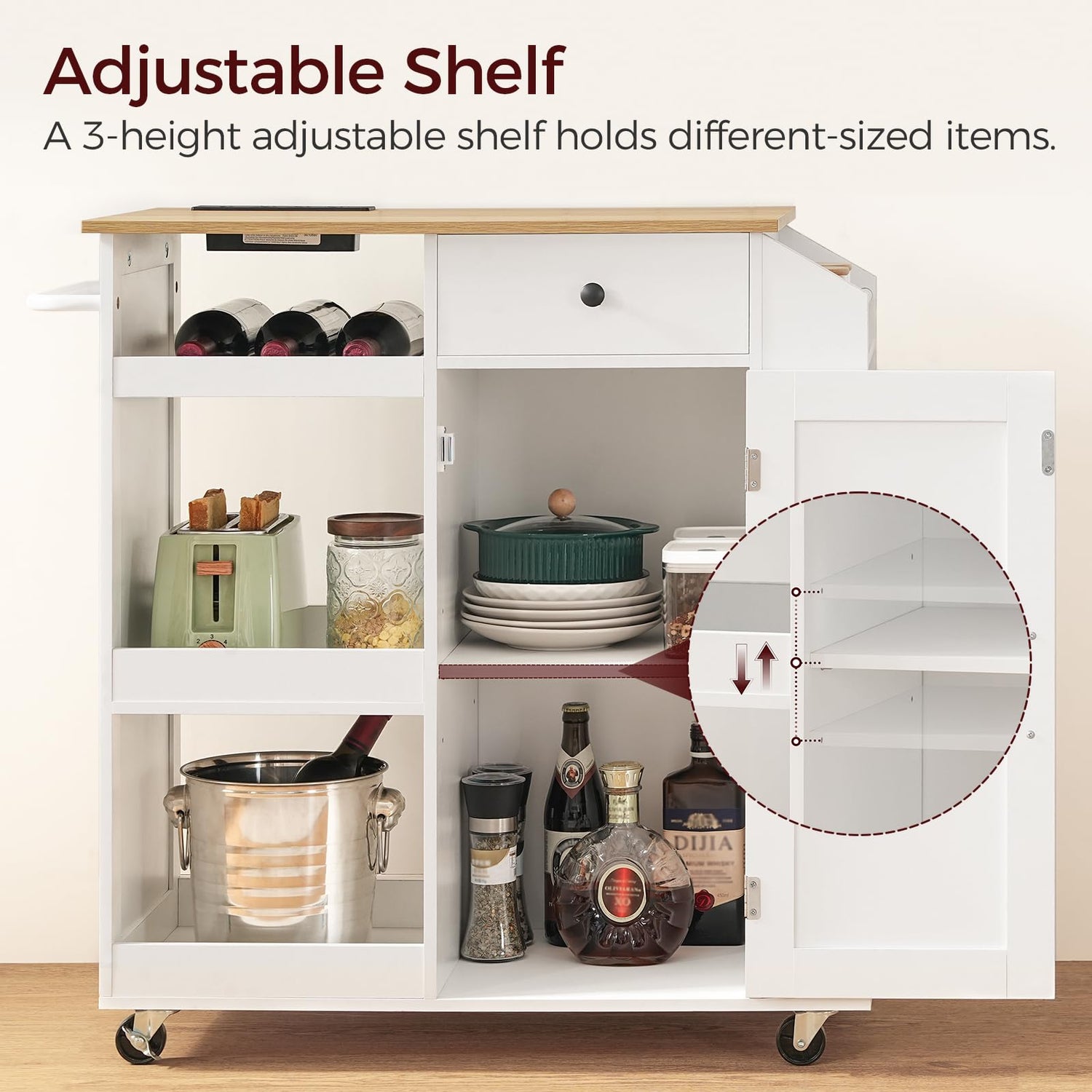 - Spacious Storage: The rolling kitchen island presents ample storage with open shelves, a wine rack, a drawer, a cabinet, side spice racks and a towel holder. A 3-height adjustable shelf inside the cabinet effortlessly accommodates different-sized items
