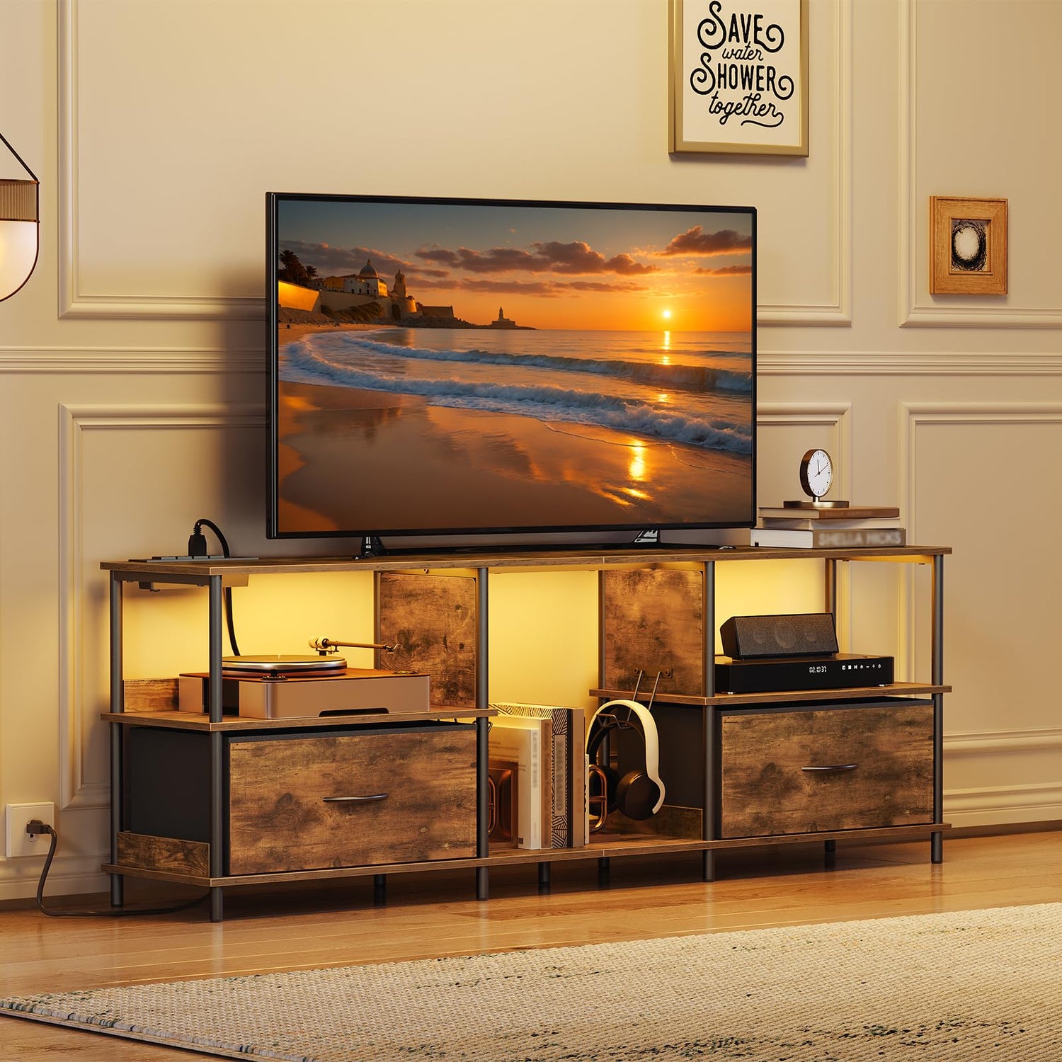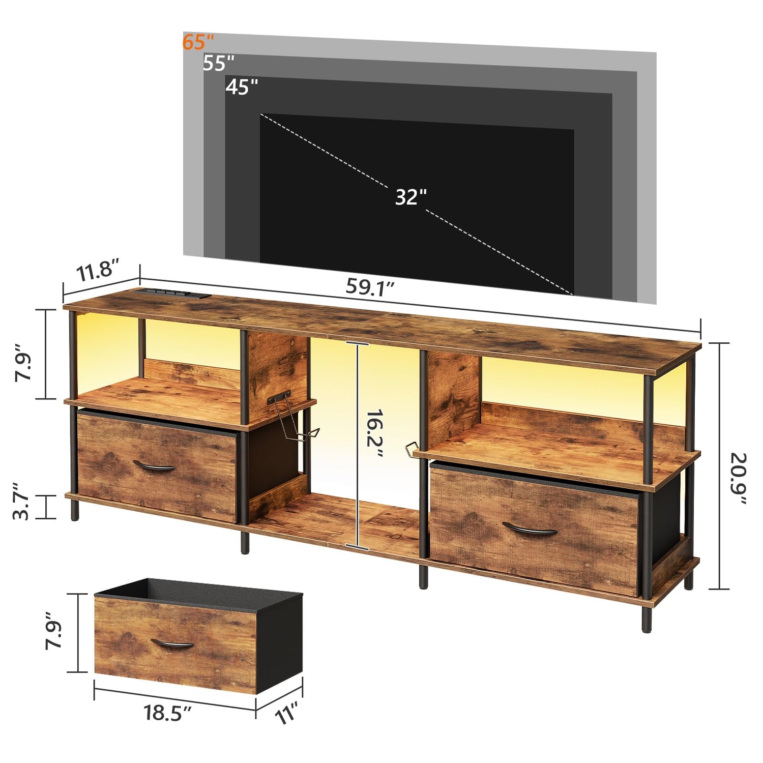 MAHANCRIS LED TV Stand with Charging Station and 2 Fabric Drawers, Entertainment Center for TVs up to 65", TV Console Table with Open Storage Shelf, for Living Room, Rustic Brown TVHR135E01