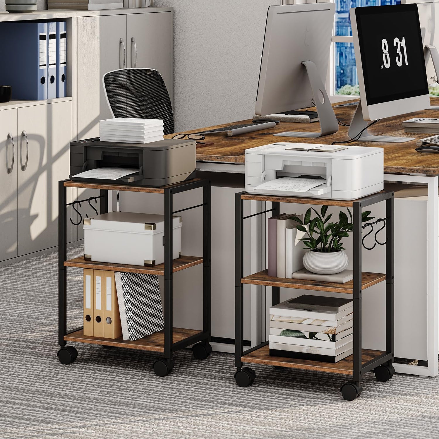 - Muti-functional Printer Cart: The maximum weight capacity of the each shelf is 44 lb, Not only can this printer table be used to hold large office supplies like scanners, copiers or laser printers, but it can also be used as a storage shelf for books, plants, and more. Suitable for home kitchen, living room, office, etc