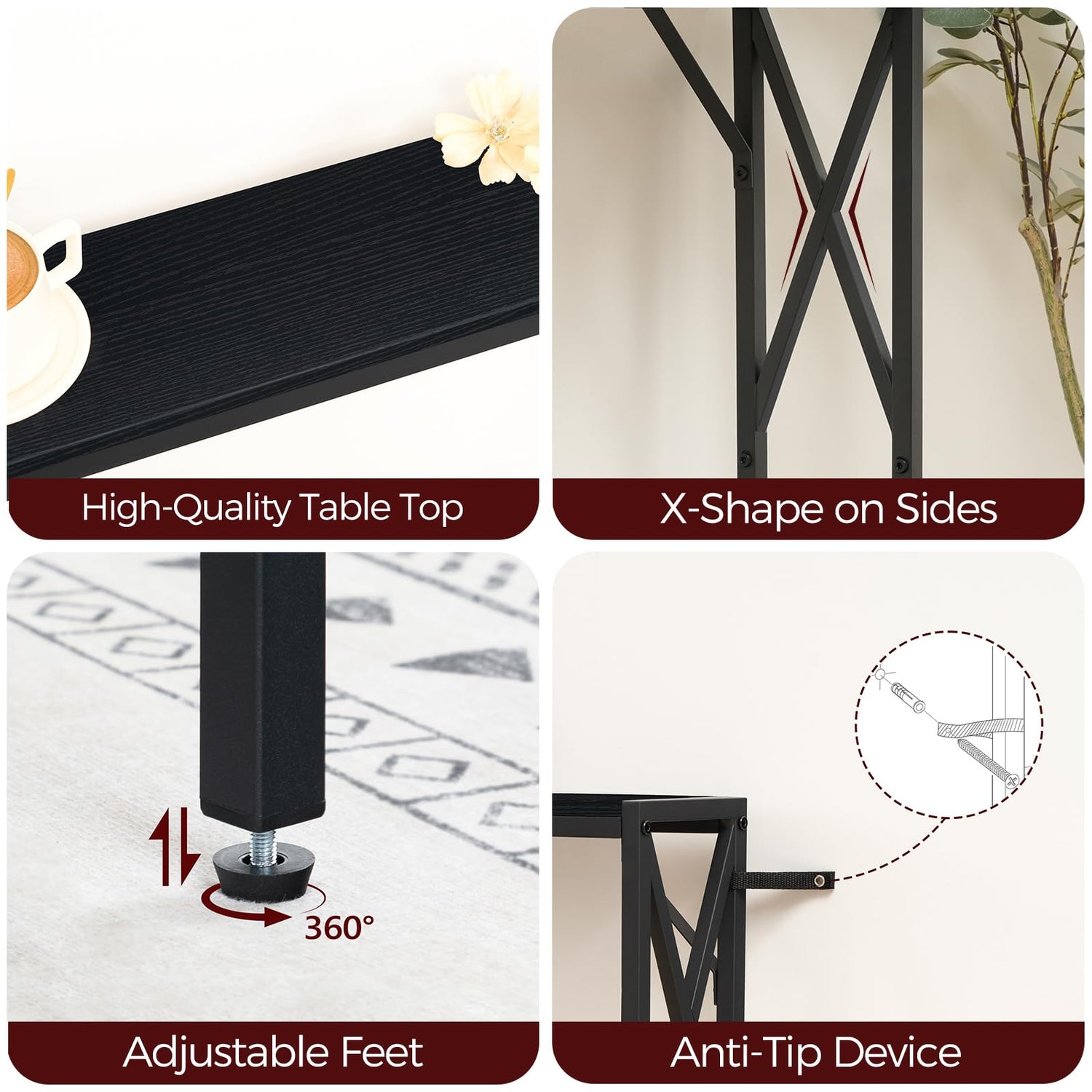 - Sturdy Structure: This behind couch table is made of a metal frame and quality particleboard with crossed iron frames on both sides and 2 iron pieces below the top to ensure the stability. 4 adjustable feet and the anti-tip kit double the security