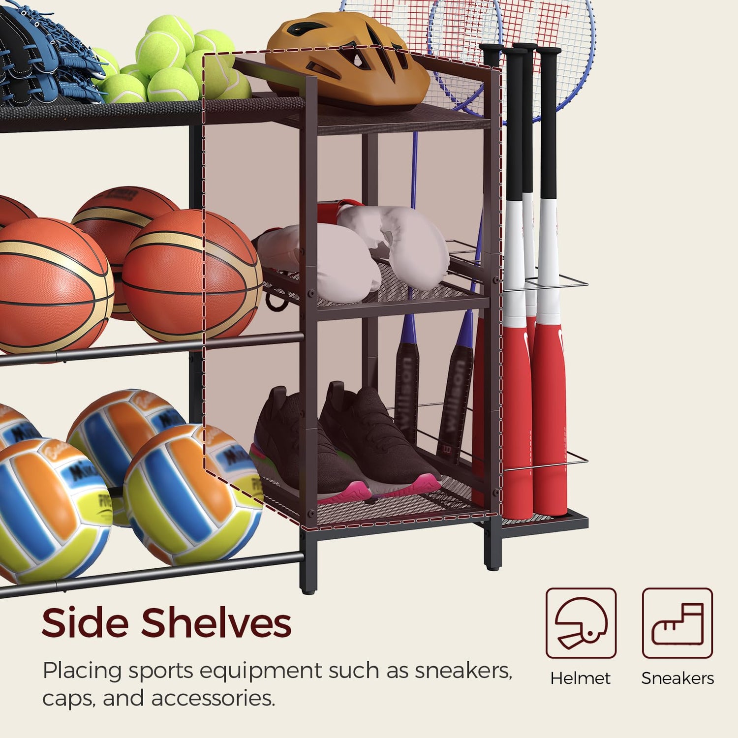 - Versatile Ball Storage Rack: The top of the ball holder stand includes an Oxford fabric sling to store badminton, baseballs, and other small balls. Two lower shelves below hold 10-12 basketballs, soccer balls or volleyball, this sports equipment storage offering categorized storage space for easy access