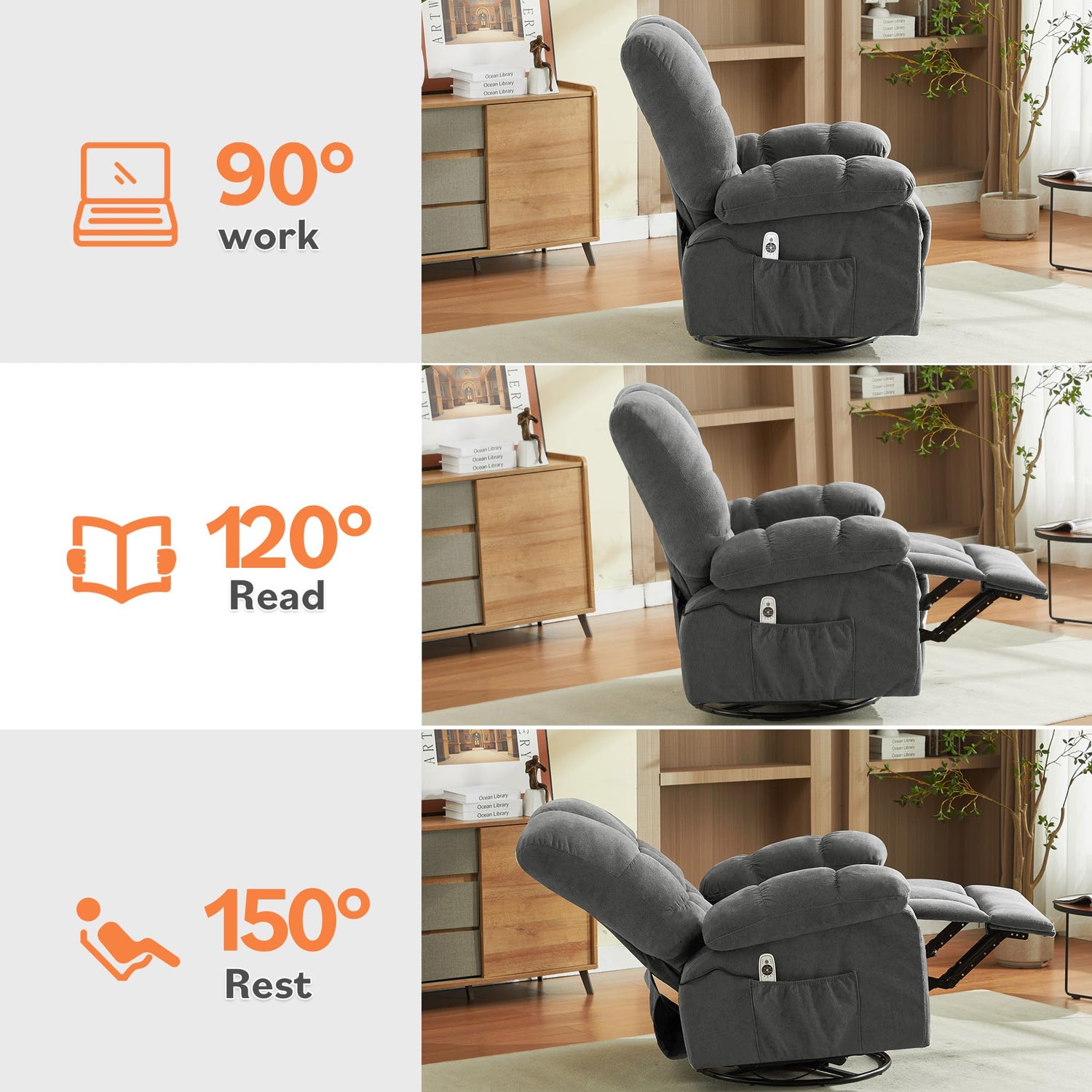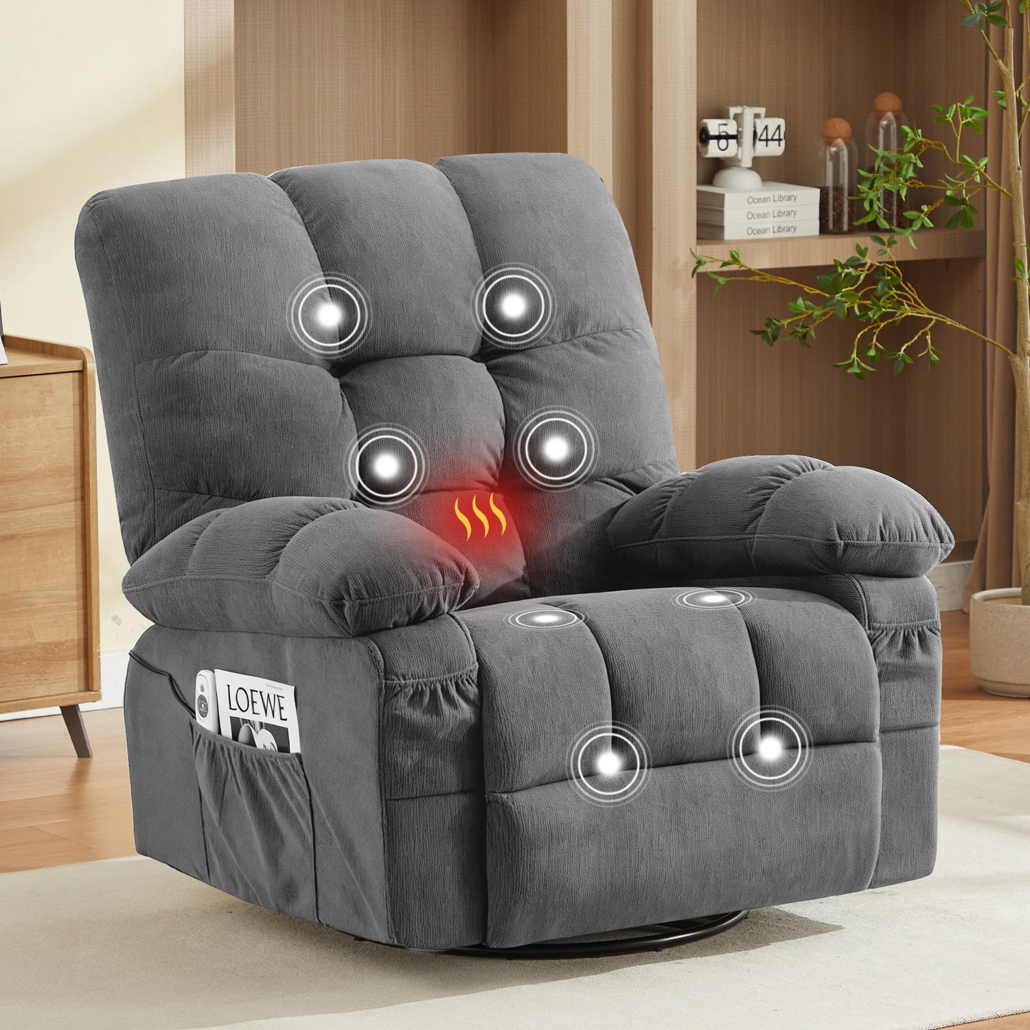 - ๐ฝ๐๐๐๐๐๐๐๐ ๐๐๐๐๐๐๐&๐๐๐๐๐๐๐:The swivel rocker recliner with massage features 8 vibration massage points and 2 intensity options, relaxing your calves, thighs, waist, and shoulders simultaneously. The built-in waist heating promotes blood circulation for a more comfortable and soothing massage experience.