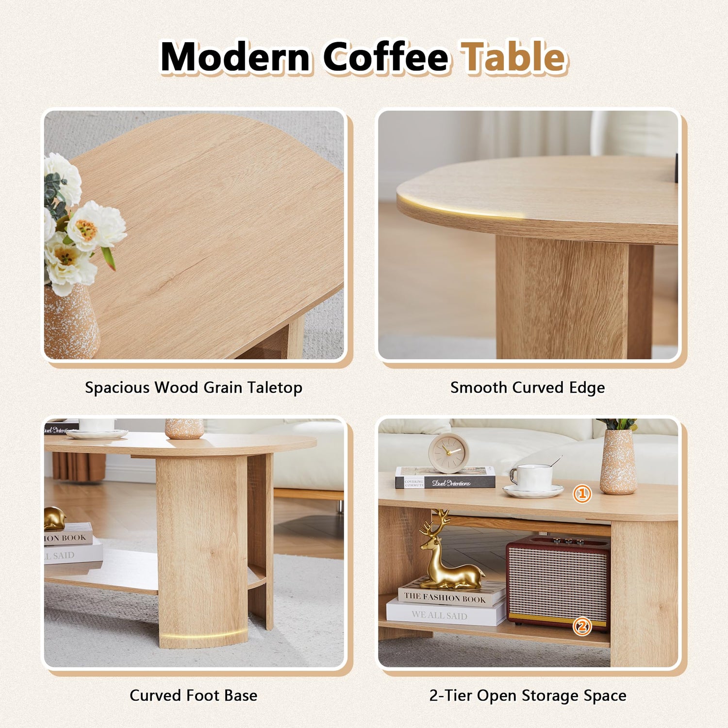 - Mid Century Modern Style: This farmhouse coffee table incorporates a graceful oval design paired with a textured wood grain finish that adds to its vintage appeal. The unique curved leg design of the table creates classic smooth lines, adding a sense of elegance and sophistication to your space. The perfect combination of functionality and fashion is realized.