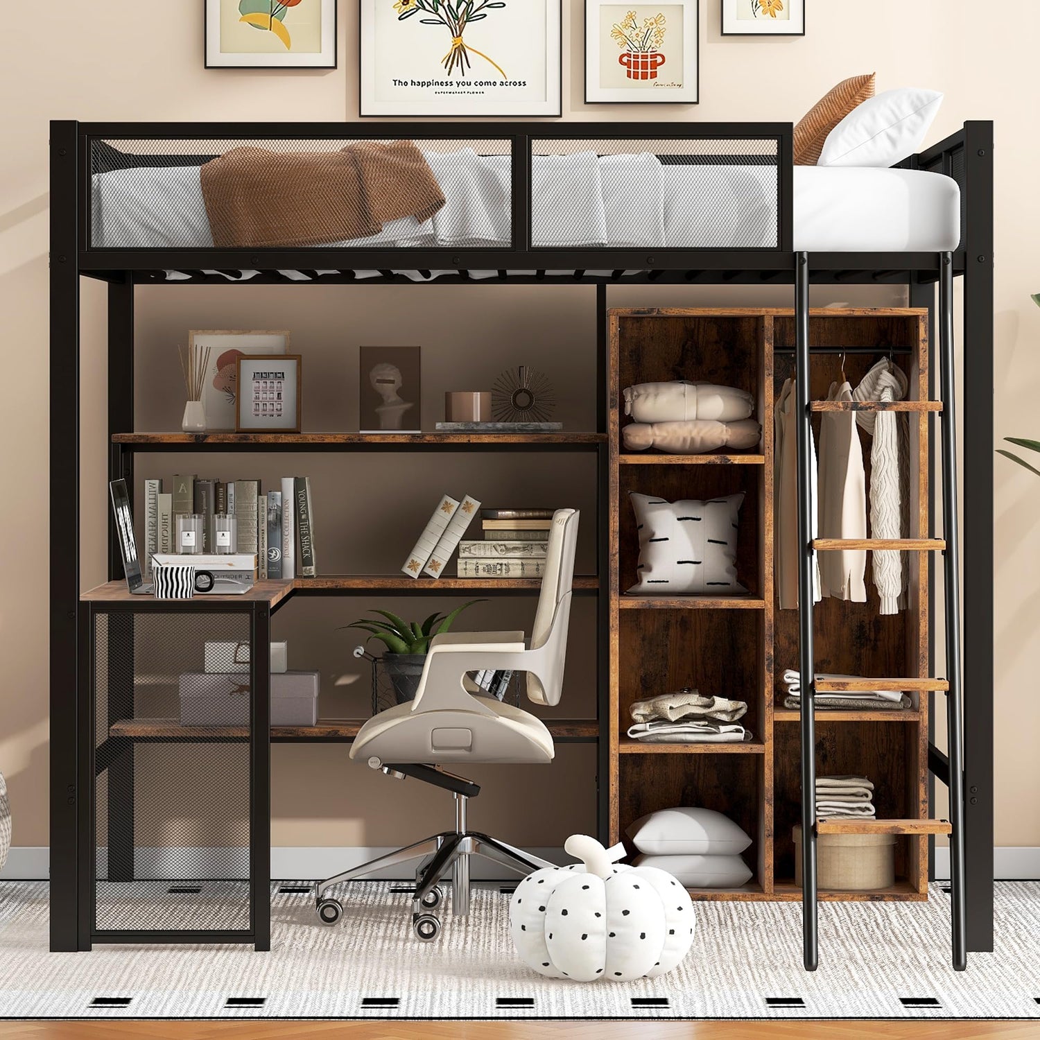 - Multifunction Loft Bed: Transform your bedroom with our versatile metal loft bed, featuring a full-size upper sleeping area perfect for restful nights and cozy evenings. The built-in desk below allows for efficient work and study while keeping your space organized and clutter-free.