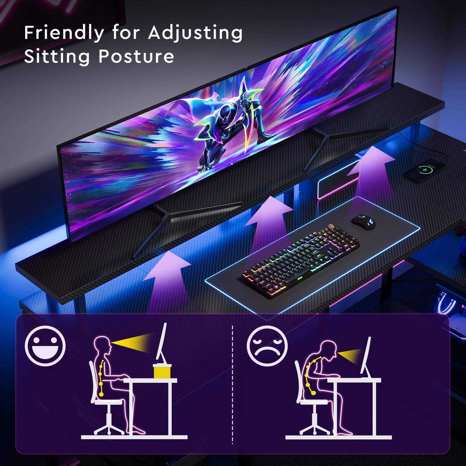- 【Gaming Desk with LED Lights】 The convertible gaming table is equipped with LED lights that can be controlled with a mobile app or remote control, with a total of 7 basic colors, 30 dynamic modes, music rhythm mode and timed mode. You can adjust the brightness as well as the color to make your office/game environment more comfortable!
