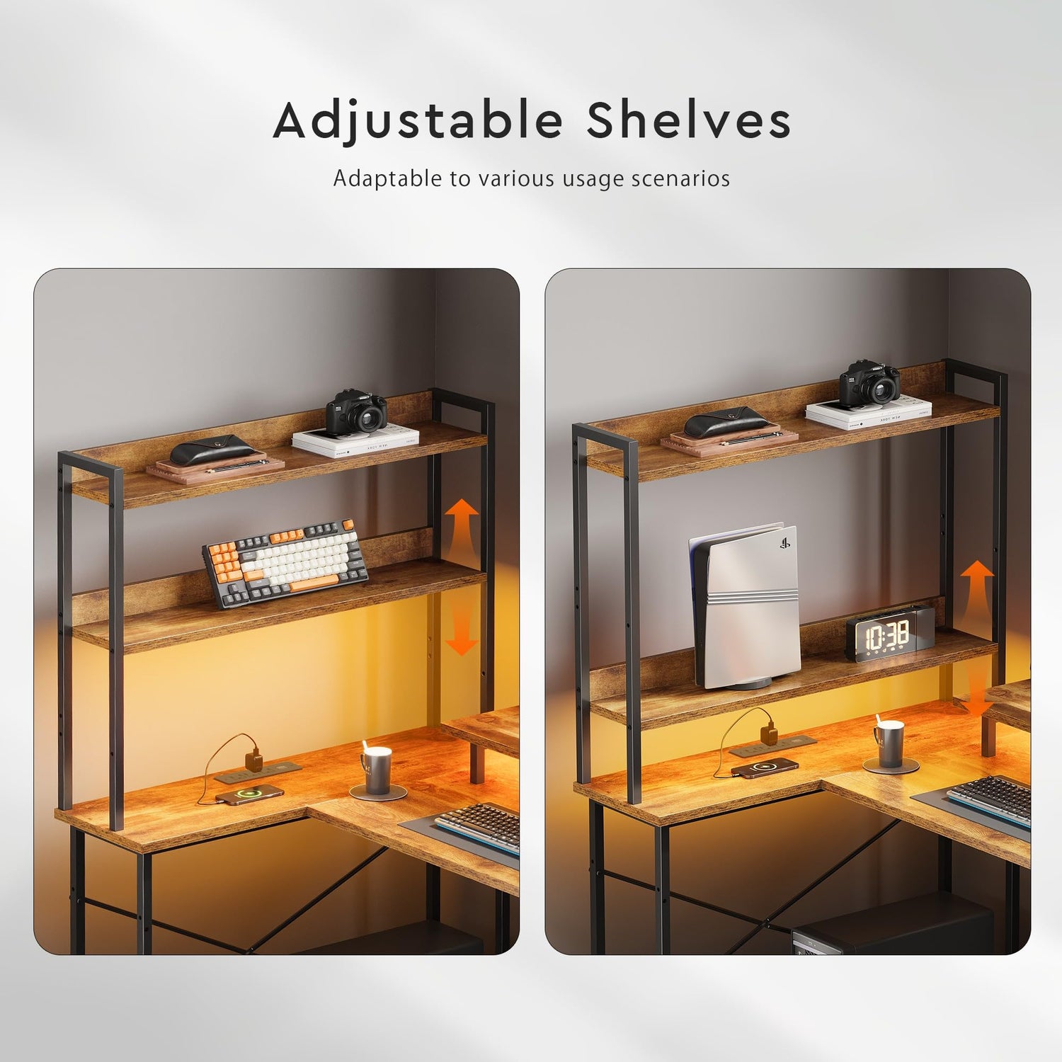 - 【Reversible & Adjustable Design】Customize your workspace effortlessly! The storage shelves can be configured left or right to fit any room layout. Plus, the adjustable shelf heights adapt to your needs, offering flexibility for different uses.