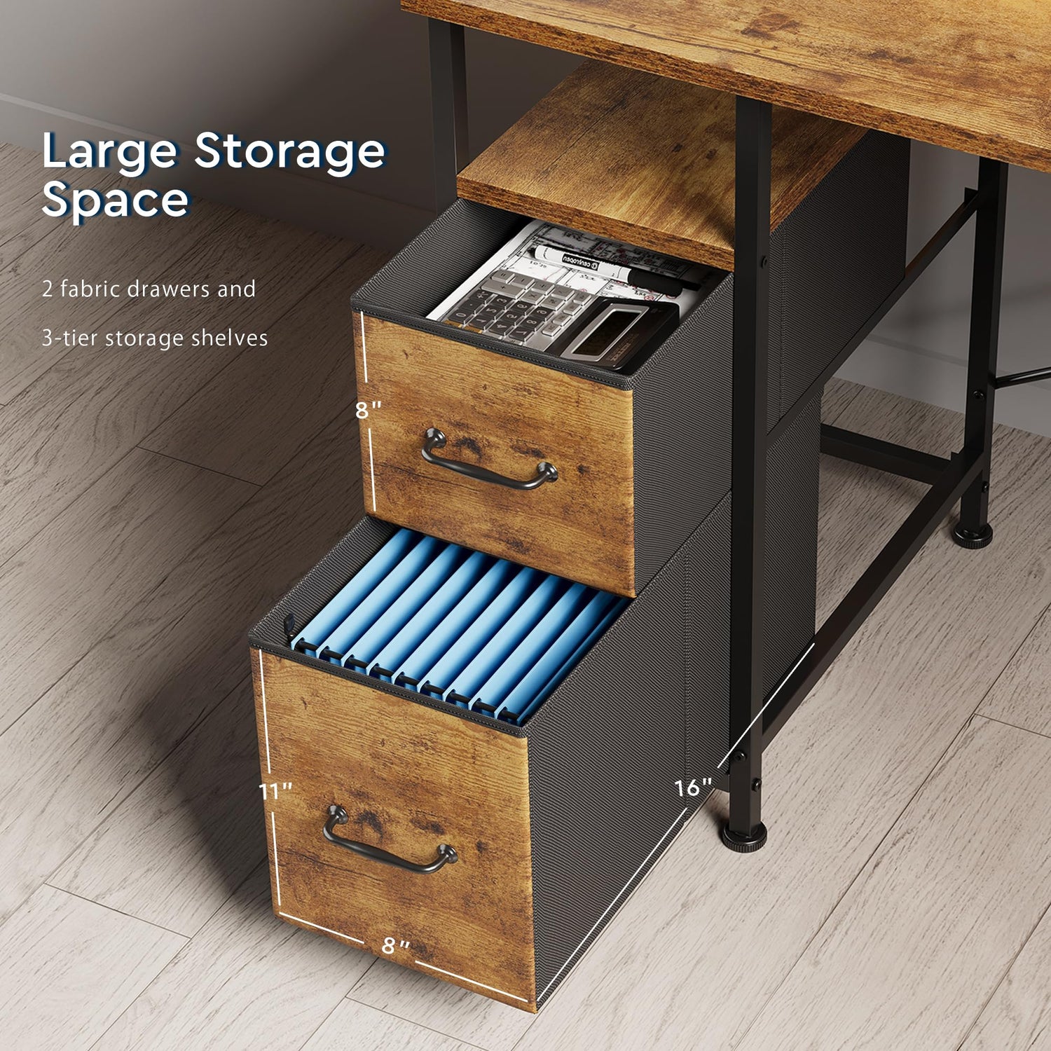 - 【Ample Storage Space】This L-shaped desk features 3-tier open shelves and 2 easy-to-assemble fabric drawers, providing generous storage for daily essentials like books, files, printers, CPUs, gaming collectibles, trophies, and souvenirs.