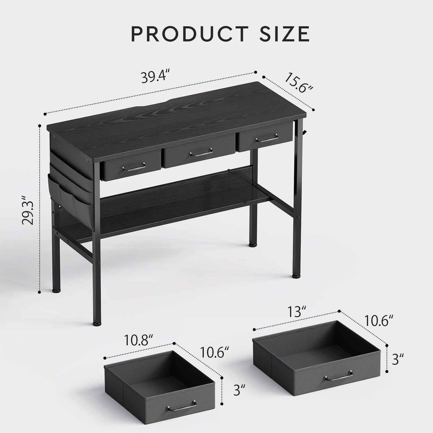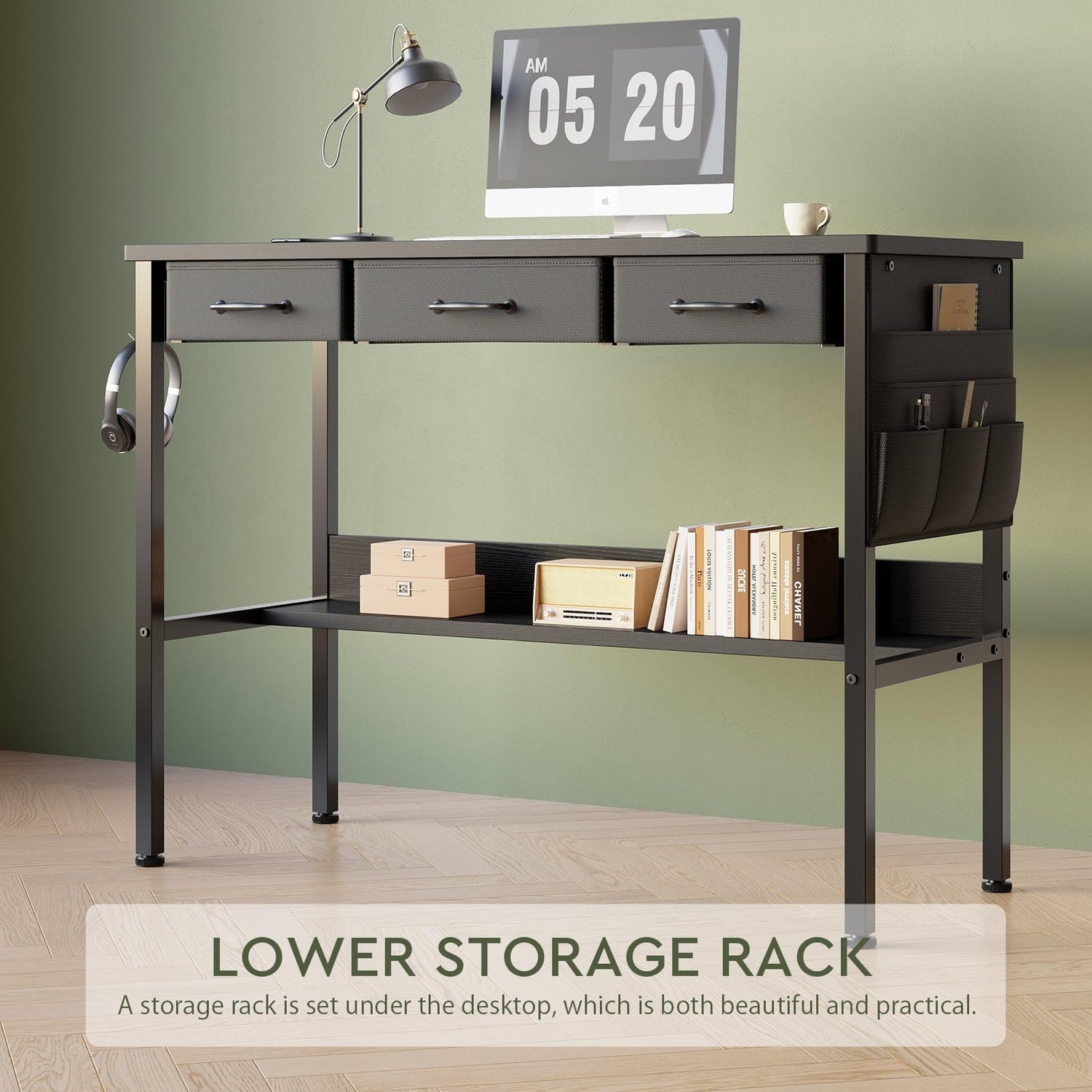 - 【Enrich Storage Space】Compared to a traditional desk, the computer desk has two more drawers, a side storage bag and an under-desk bookshelf. The extra storage space can more effectively organize the work space in the home or office. The bookshelf makes full use of the space below the desktop, which is more suitable for the storage needs of small space.