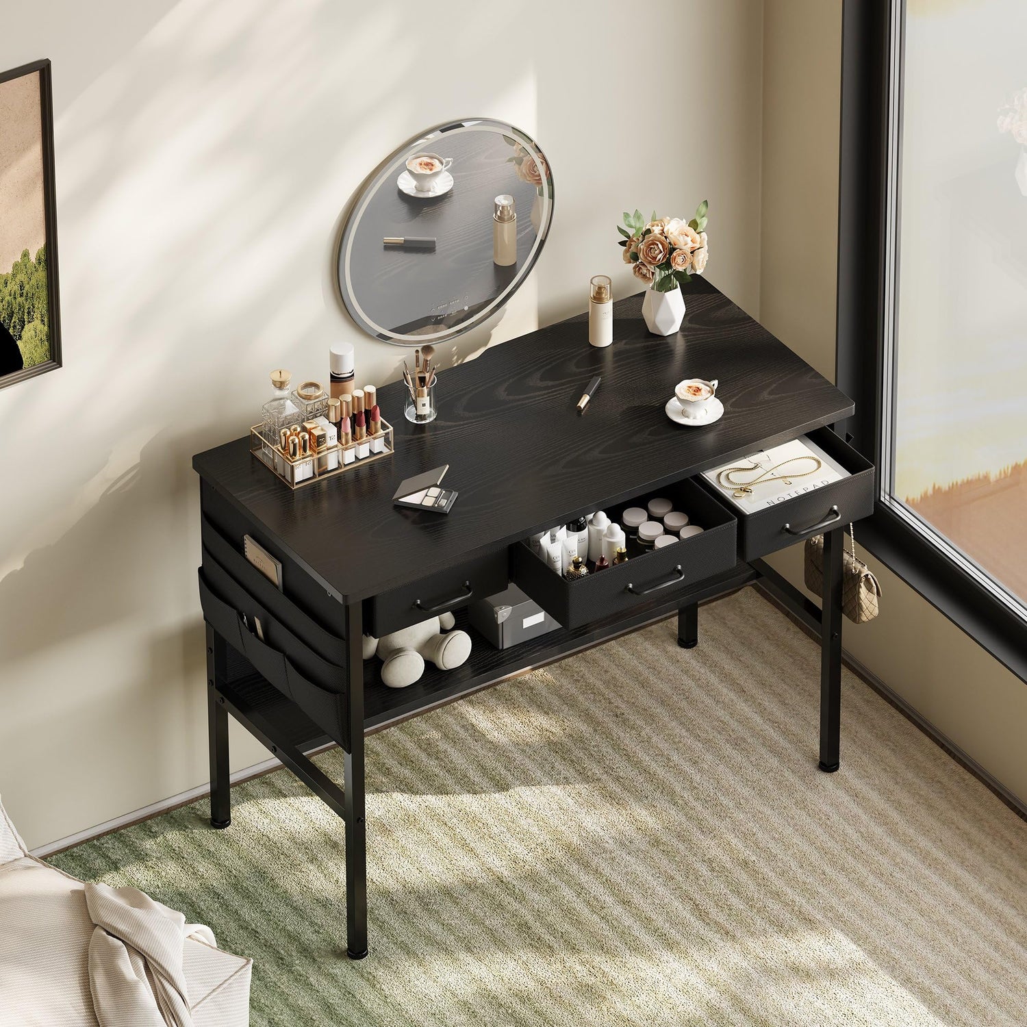 - 【More Detailed Design】 A Versatile Hook can be used for hanging your Headphone, Bag, and other useful gadgets. The back of the desktop is designed with a gap for the charging cable to pass through, so that the small desk with storage drawers can be completely attached to the wall.The storage bag of this desk can be installed on both sides of the table in order to adapt to different needs. The size of the table is also ideal for use as a makeup vanity.