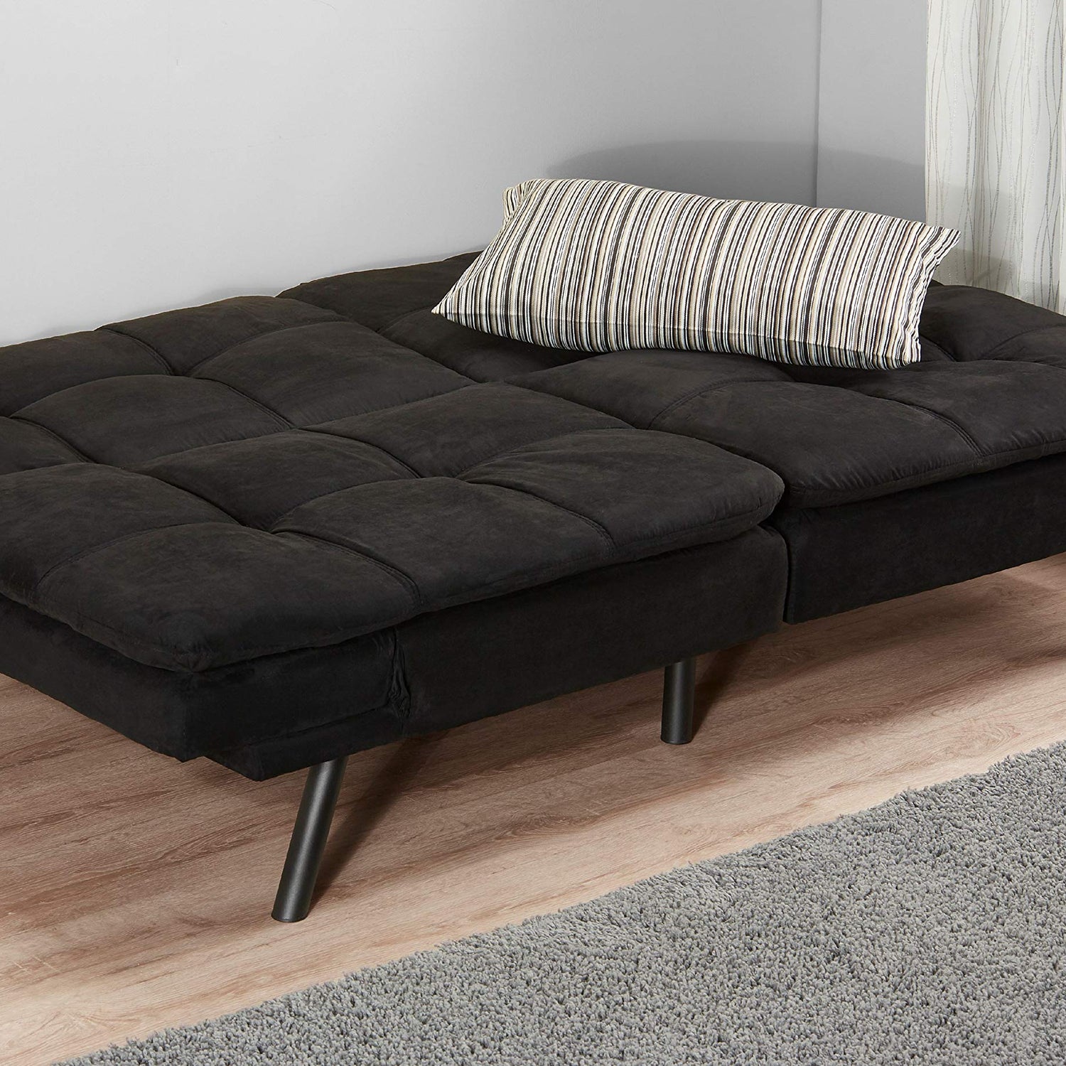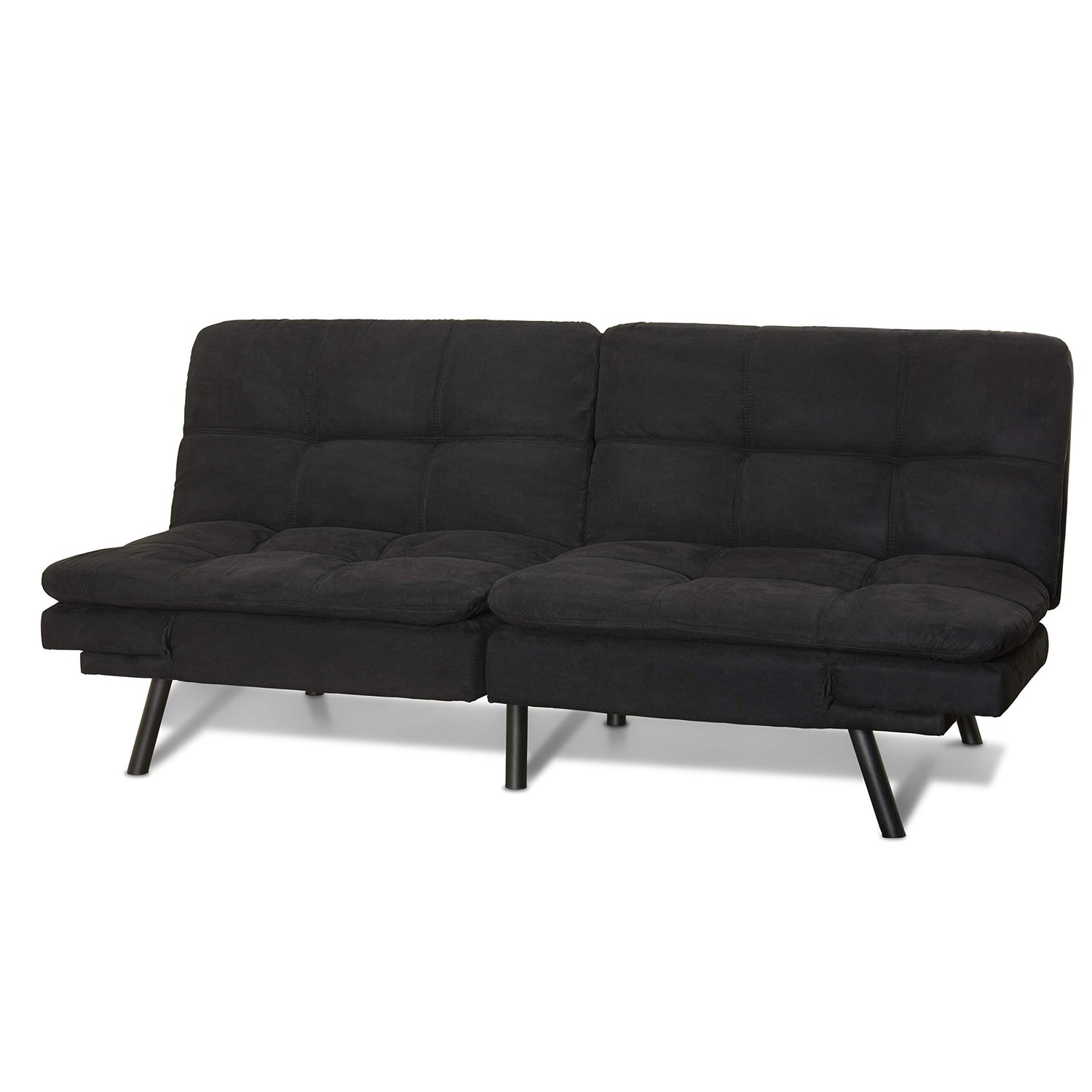 Details: Improved comfort Contemporary design upholstered in soft, black suede fabric Split seat and back Memory foam provides good support Converts from sofa to sleeper in seconds Foldable winged armrest Sturdy wood frame and metal legs Supports up to 600 lbs. Fill: 100% polyurethane foam Upholstery: 100% polyester. Simple assembly required. Manual included. Seat dimensions: 72"W x 34"D x 32''H Sleep dimensions: 72"W x 42.5"D x 16.5"H Futon care: Spot clean with wet cloth or professional fabric cleaner. Do Not expose memory foam to direct sunlight.