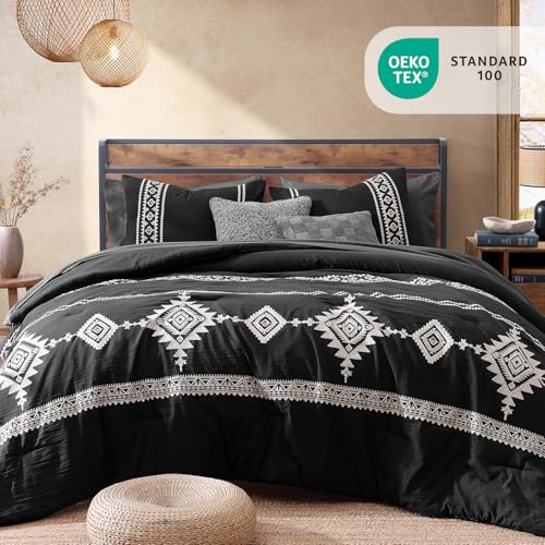 MaiRêve Embroidery Queen Size Comforter Set Black, Boho Farmhouse Western Bedding Set 7 Pieces, All Season Bed in A Bag Comforter Set with Sheets, Pillowcases & Shams