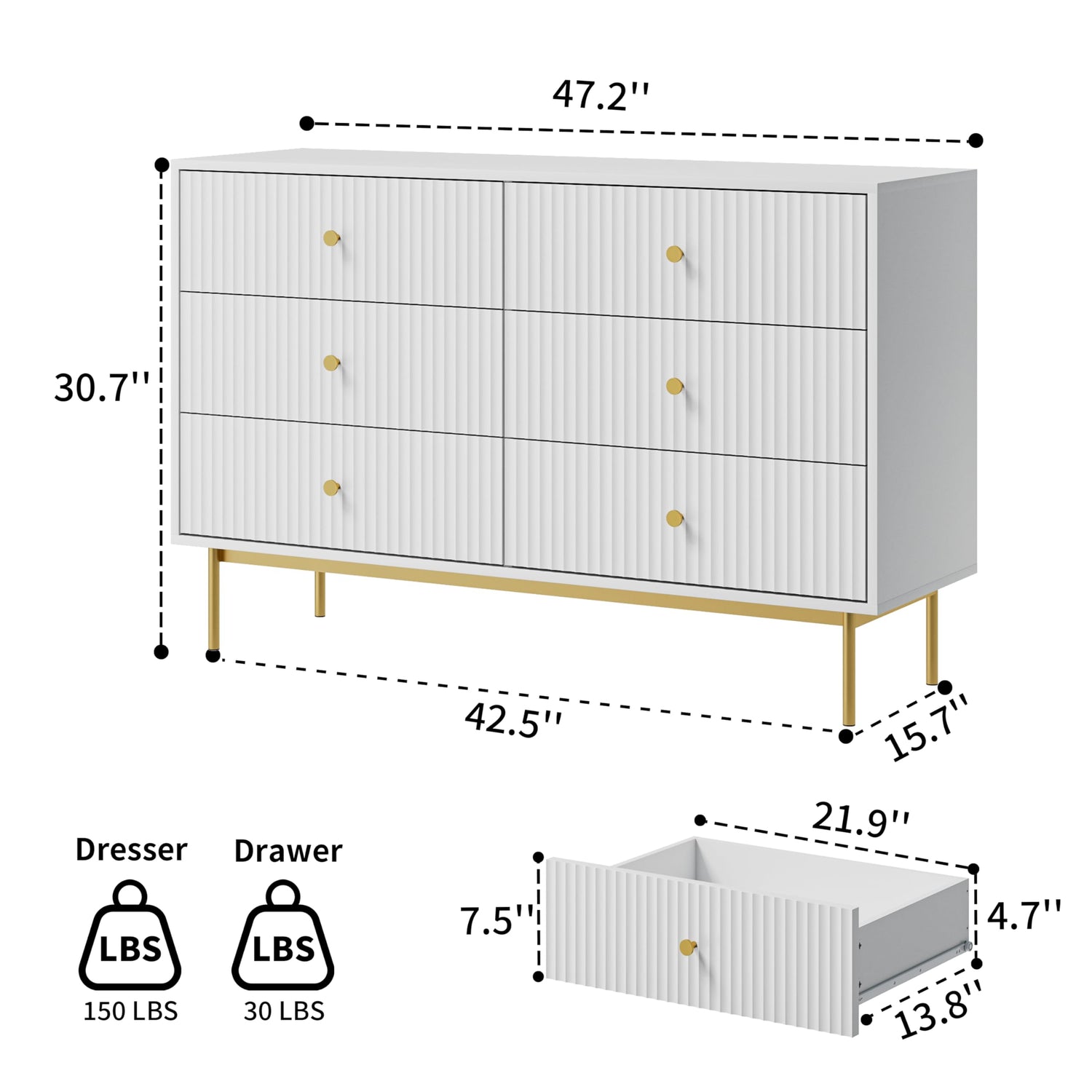 MAISONARIA 6 Drawer Double Dresser for Bedroom, White Dresser with Gold Handles, White 6 Drawer Dresser with Fluted Panels, Modern Wood Dresser Chest for Bedroom
