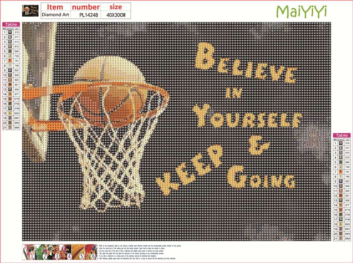 MaiYiYi Basketball Diamond Painting Dots Kit, 5D Full Round Diamond Painting Kit Believe in Yourself and Keep Going Diamond Art Basketball Hoop Wall Decor for Adult Beginners (30X40 CM)