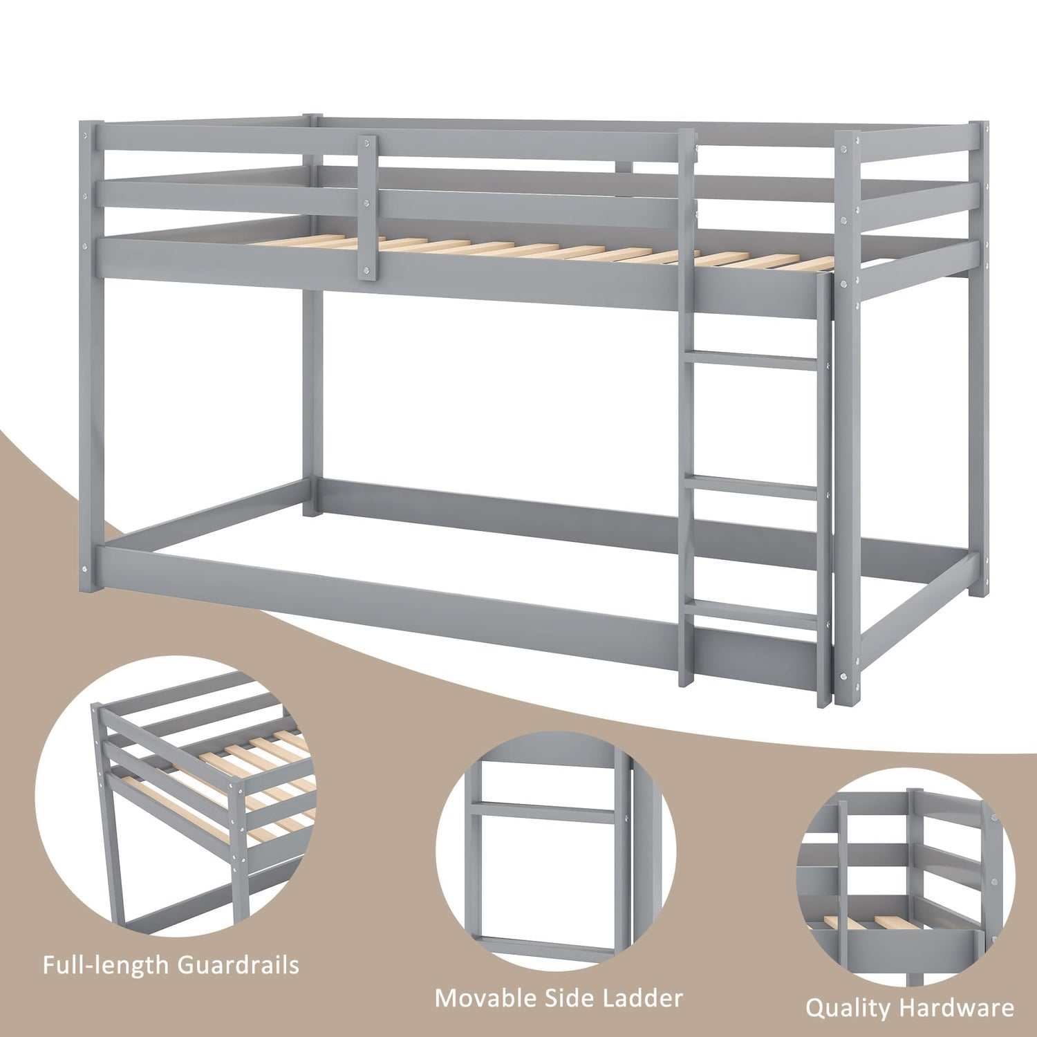 Majnesvon Low Bunk Bed Frame - Solid Wood Twin Over Twin with Integrated Ladder and Full Guardrails