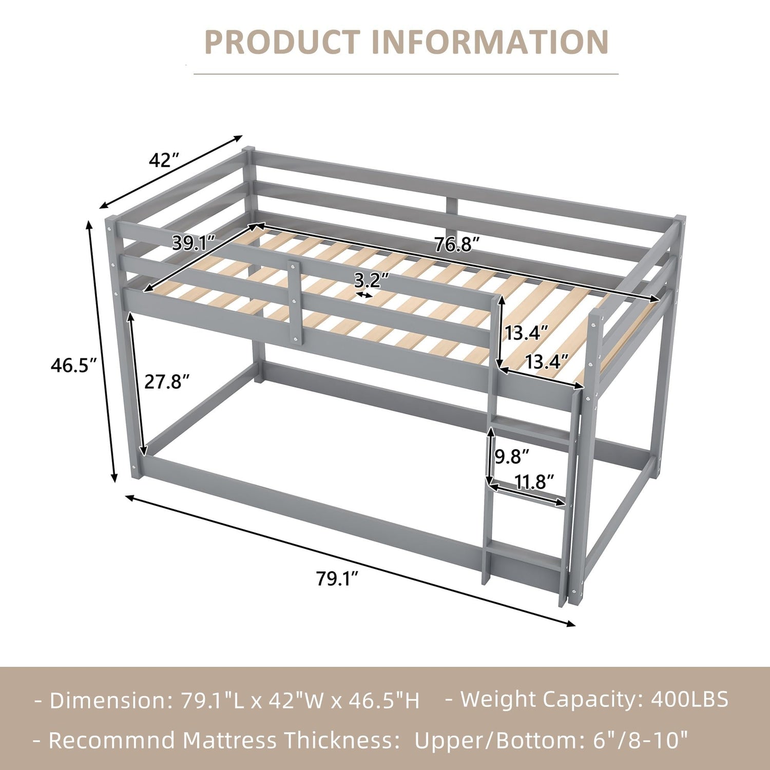 Introducing the Majnesvon Low Bunk Bed Frame, a perfect blend of style, safety, and functionality. Crafted from high-quality solid wood and MDF, this twin over twin bunk bed is designed with your family's needs in mind.