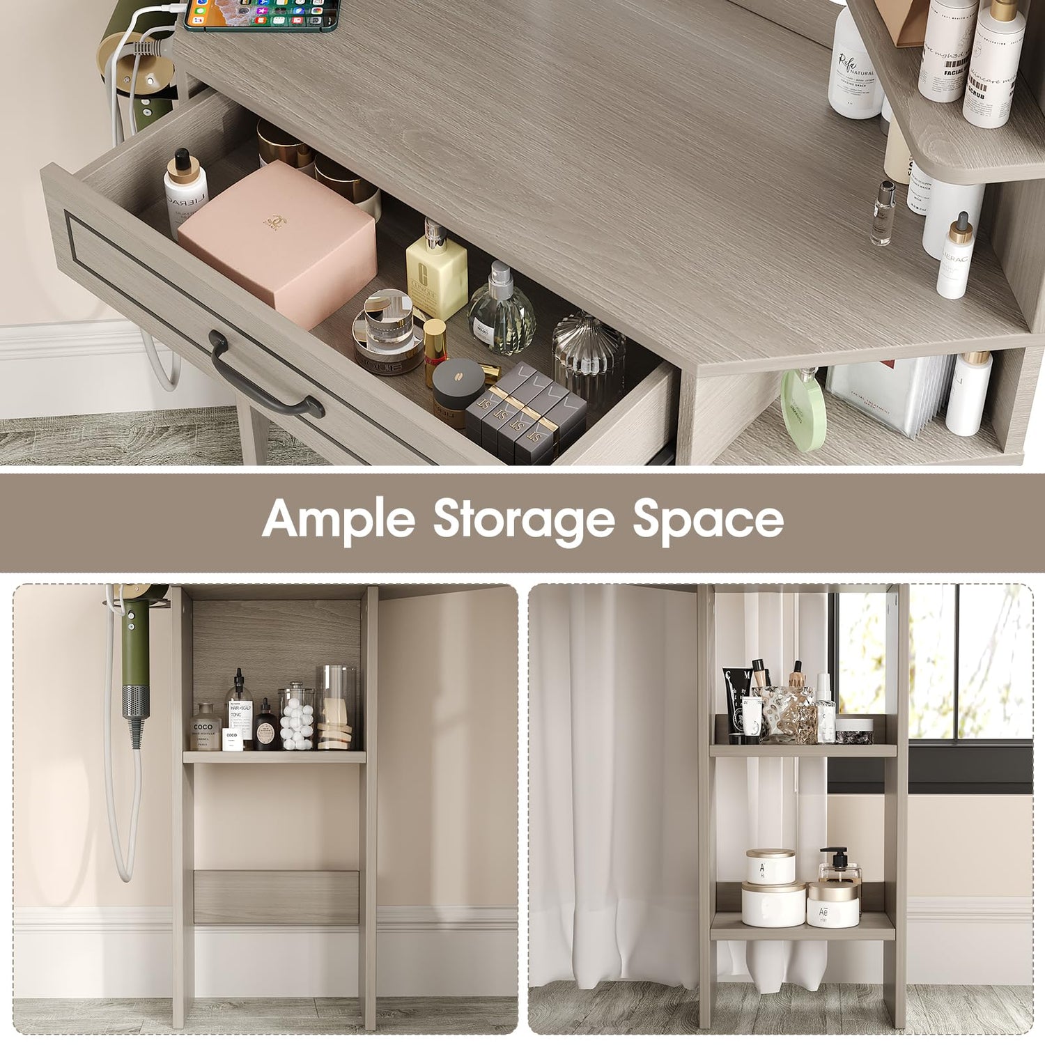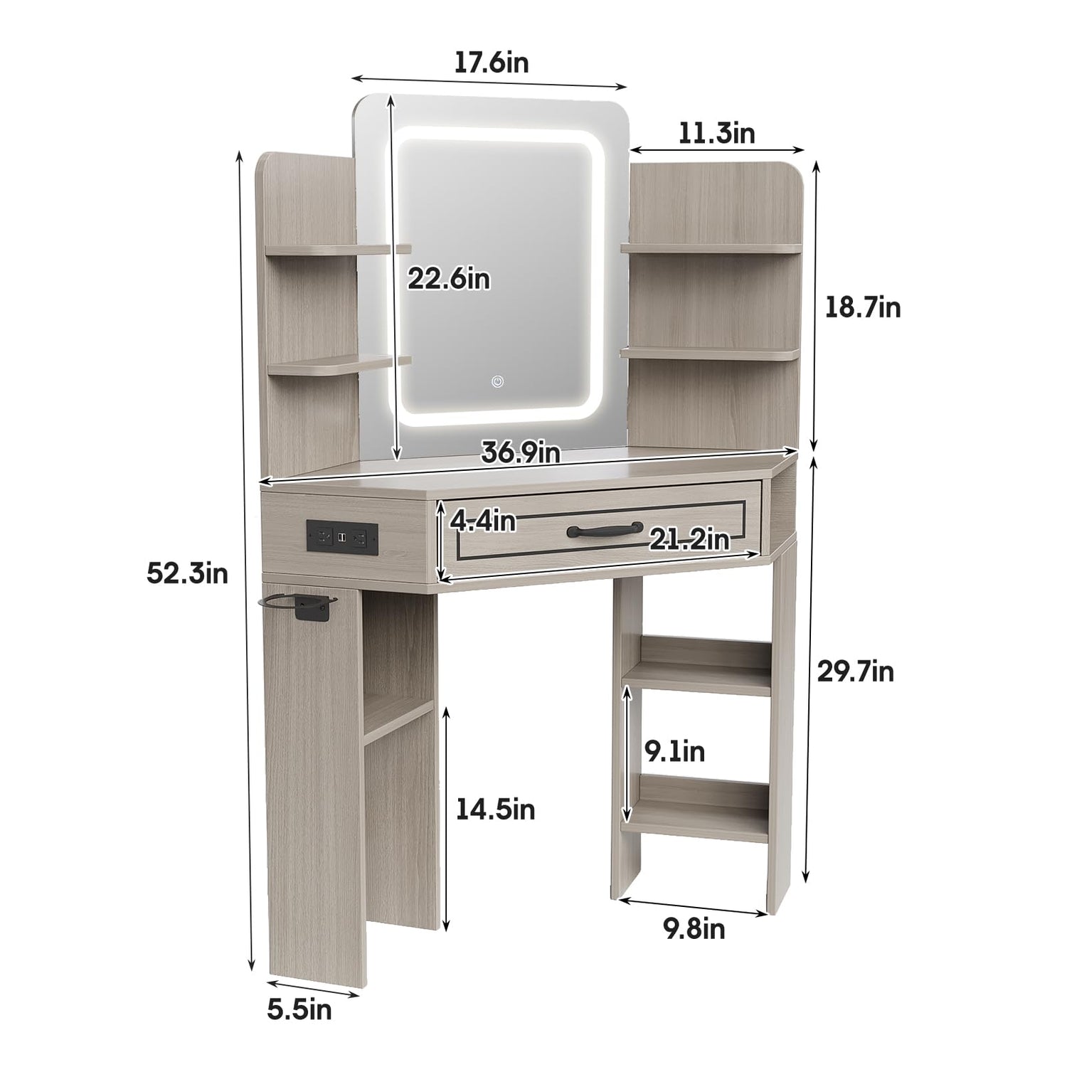 Makeup Vanity Desk, Corner Vanity with Large LED Mirror,Lots Open Shelves,Gray Vanity with Charging Station,Farmhouse Makeup Vanity Table with 3 Lighting Modes, Brightness Adjustable