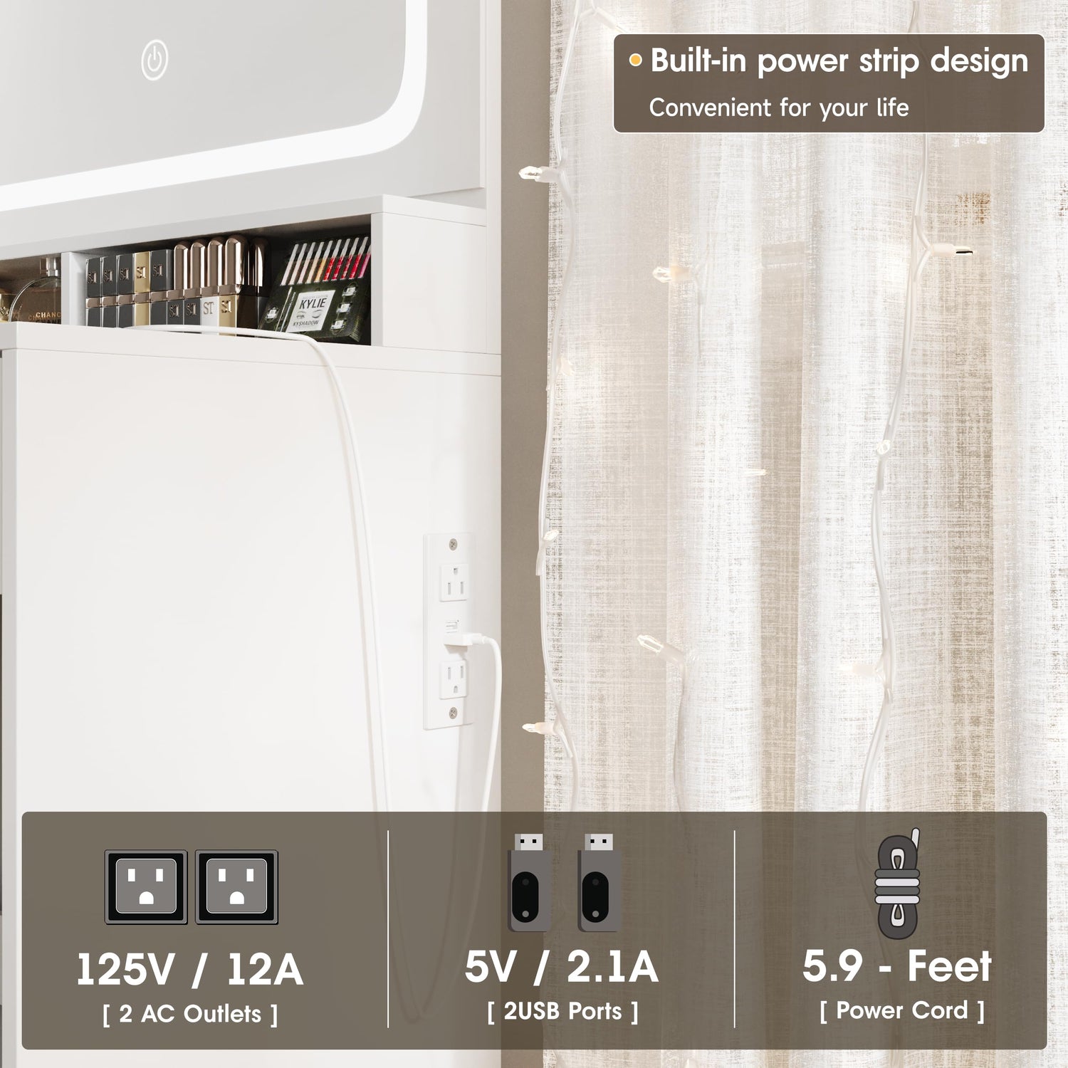 - 【Built-in Power Outlet】This vanity desk comes with 2 standard sockets and 2 USB ports, so you can easily use a hair dryer, curling iron, cosmetic instruments, etc. in front of the mirror. Whether it's your smartphone, tablet, smartwatch, you can ensure they're always charged and ready to go. The perfect combination of style and practicality, this makeup vanity desk is a great addition to bedrooms, dressing rooms, makeup rooms, and other spaces.