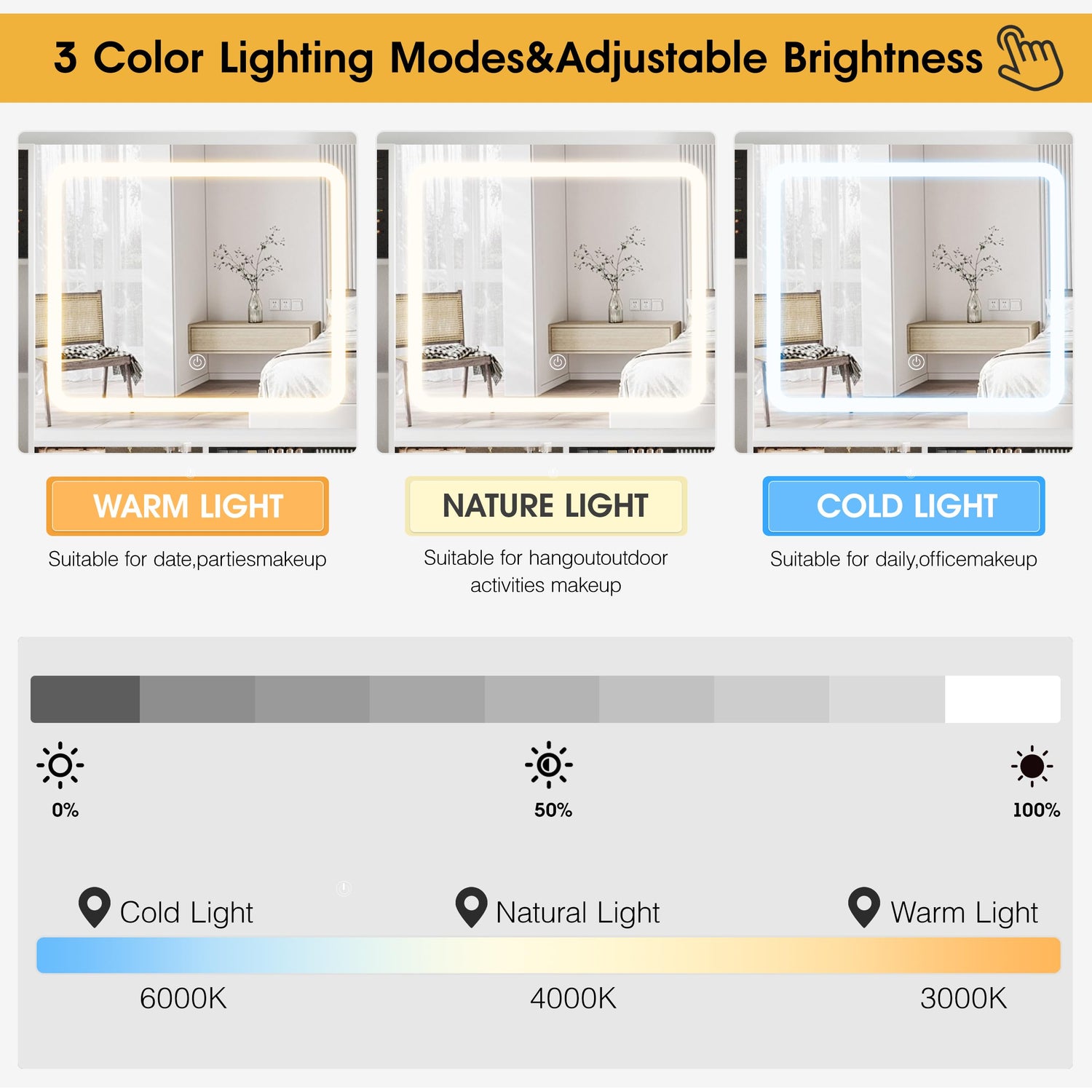 - 【Brightness Adjustable LED light】The LED light of the vanity table has 3 different color modes: warm yellow, warm white and cold white. Touch the switch to change the color mode, and long press the switch to adjust the light brightness. You can adjust the light brightness and color according to your preferences. For daily makeup, It is definitely a good helper for daily makeup.