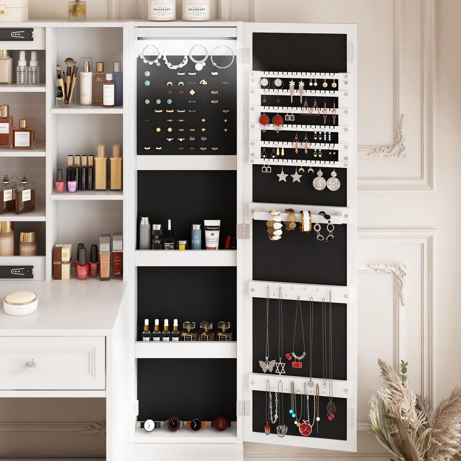 - 【Functional 2-in-1 Design】Super Large Capacity, this make up vanity is a perfect combination of vanity and jewelry armoire. Constructed with 1 jewelry cabinet, 4 drawers, and lots storage shelves, can easily store all of your cosmetics and jewelry.
