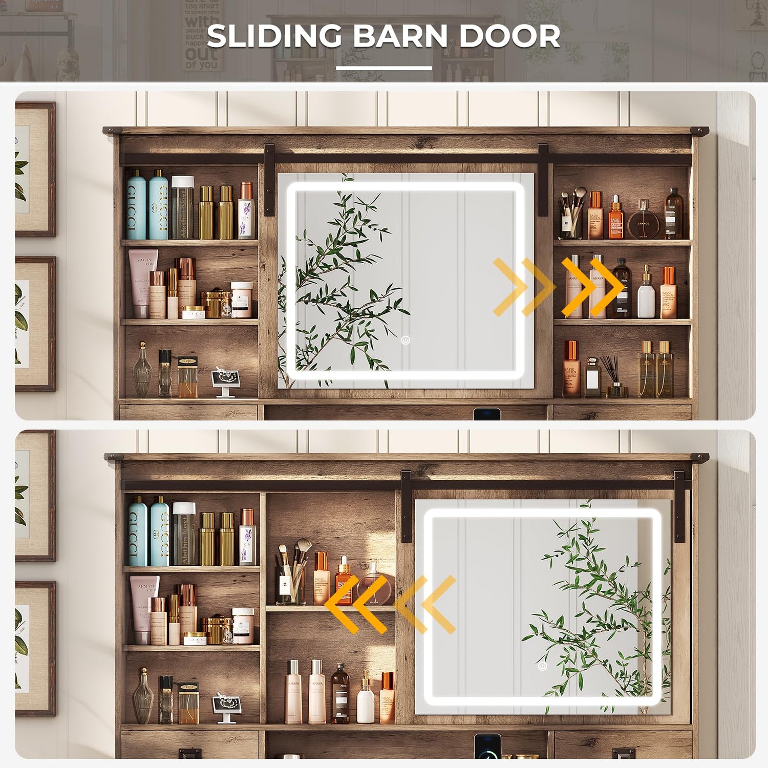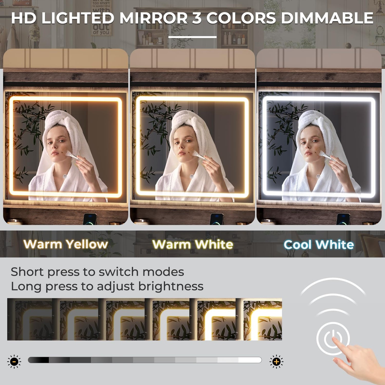 - [3 Color Adjustable Touch Screen Mirror] This farmhouse vanity features a makeup mirror with touchscreen adjustment. Click the screen to wake up/switch the color mode (cool white, warm white, warm yellow), and long press to adjust the brightness. Simple operation and easy to use. The smart dimming mirror provides the perfect lighting environment for your makeup