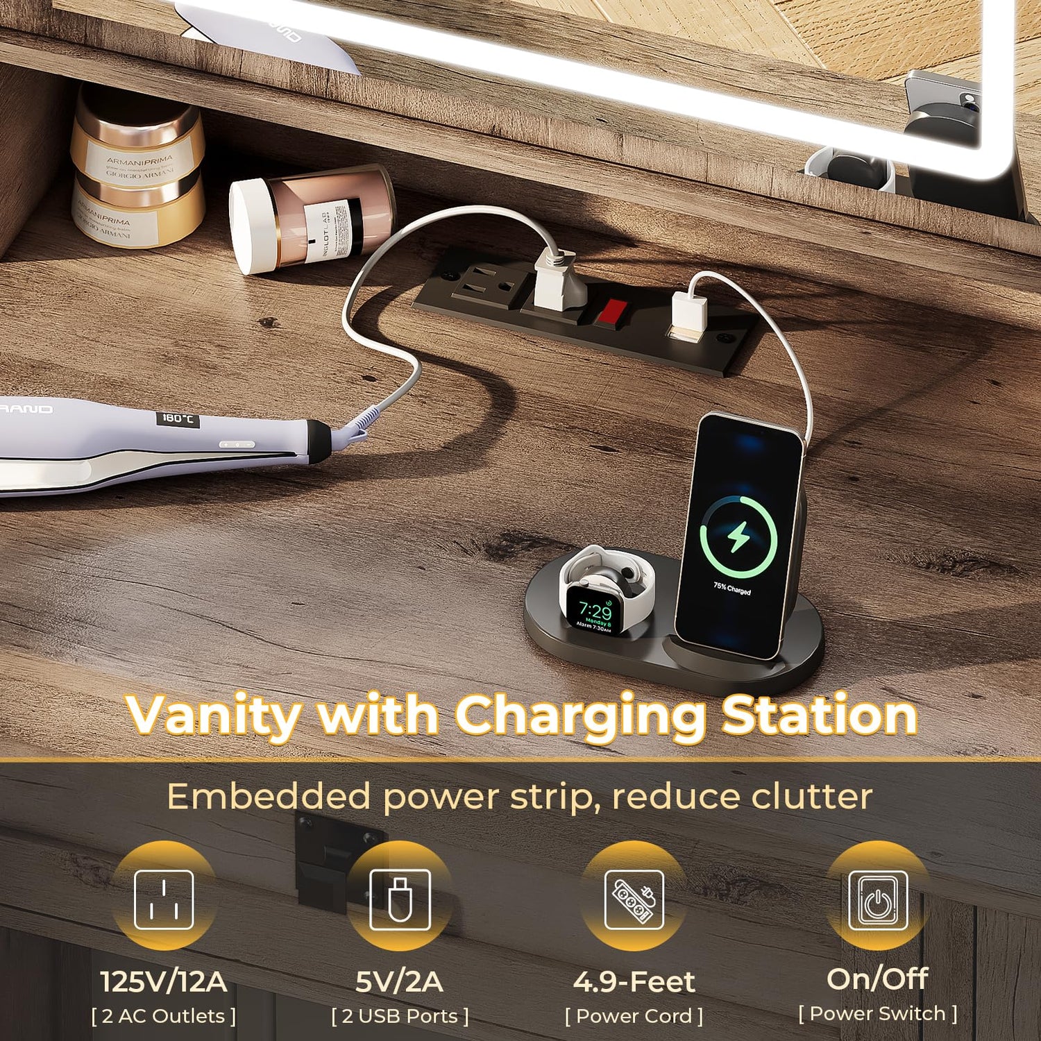 - [Makeup Vanity With Charging Station] Equipped with a charging station, including 2 standard plug sockets and 2 USB ports, which is more convenient for connecting hair dryers, curling irons, etc., and can also charge your mobile phone/tablet/smartwatch. Embedded power strip reduces desk clutter. You can also control the power supply with one click, making it more convenient to use