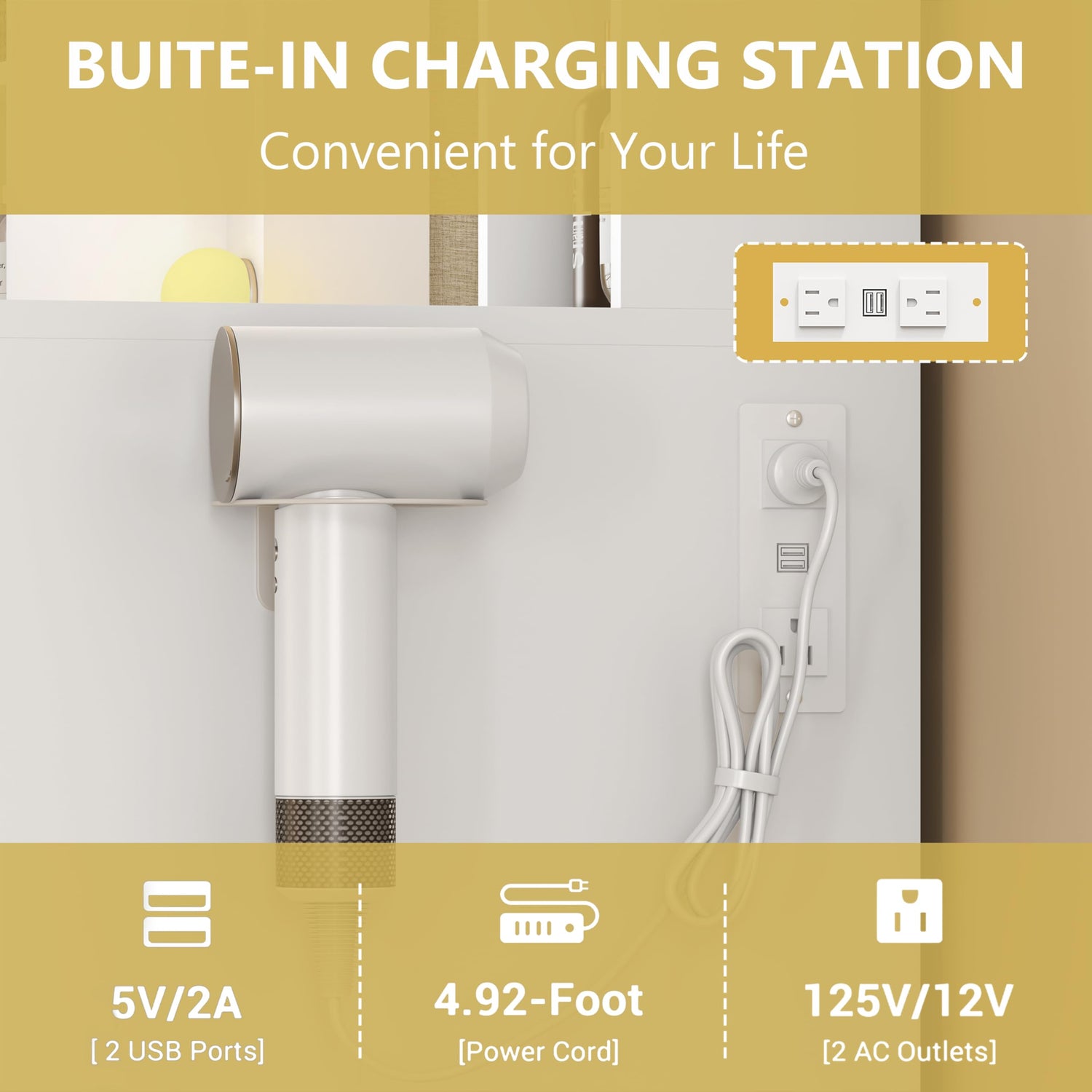 - 【Convenient Charging Station & Hair Dryer Rack】The kids/girls vanity comes with a power strip, including 2 AC outlets and 2 USB ports, through which you can charge and use electronic devices at the same time. In addition, our vanity table set provides you with a hair dryer rack to keep your hair dryer and hair curler within arm’s reach