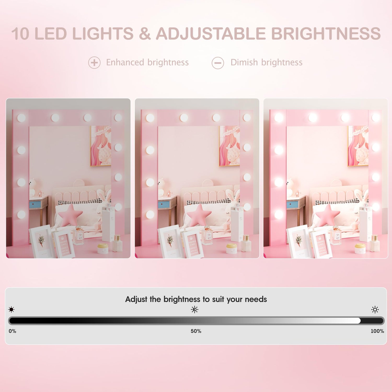 - Cute Pink Vanity with Lights:10pcs dimmable LED bulbs, enhances the beauty of your bedroom. Great modern look, very popular with young girls. Also suitable for home bedroom or school dormitory, great gift choice for daughter