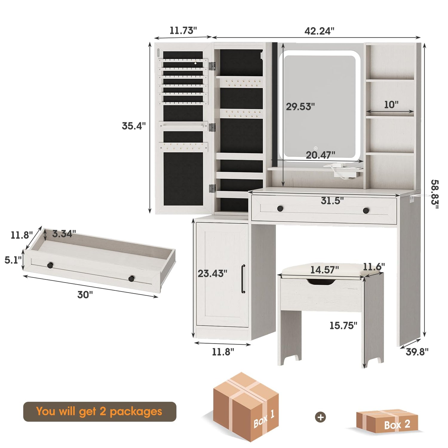 - 【Unique Jewelry Armoire Design】This vanity desk is equipped with a jewelry cabinet,with 96 ring slots, 54 earring slots, 39 necklace hooks, 3 cosmetic shelves and a bracelet rod, you can sort out all the collections you cherish.a ideal gift for daughters, wife, mom or anyone who is looking for vanity with mirror and lights for their friends and family.NOTE: DRESSERS AND JEWELRY CABINETS WILL NOT BE DELIVERED AT THE SAME TIME.