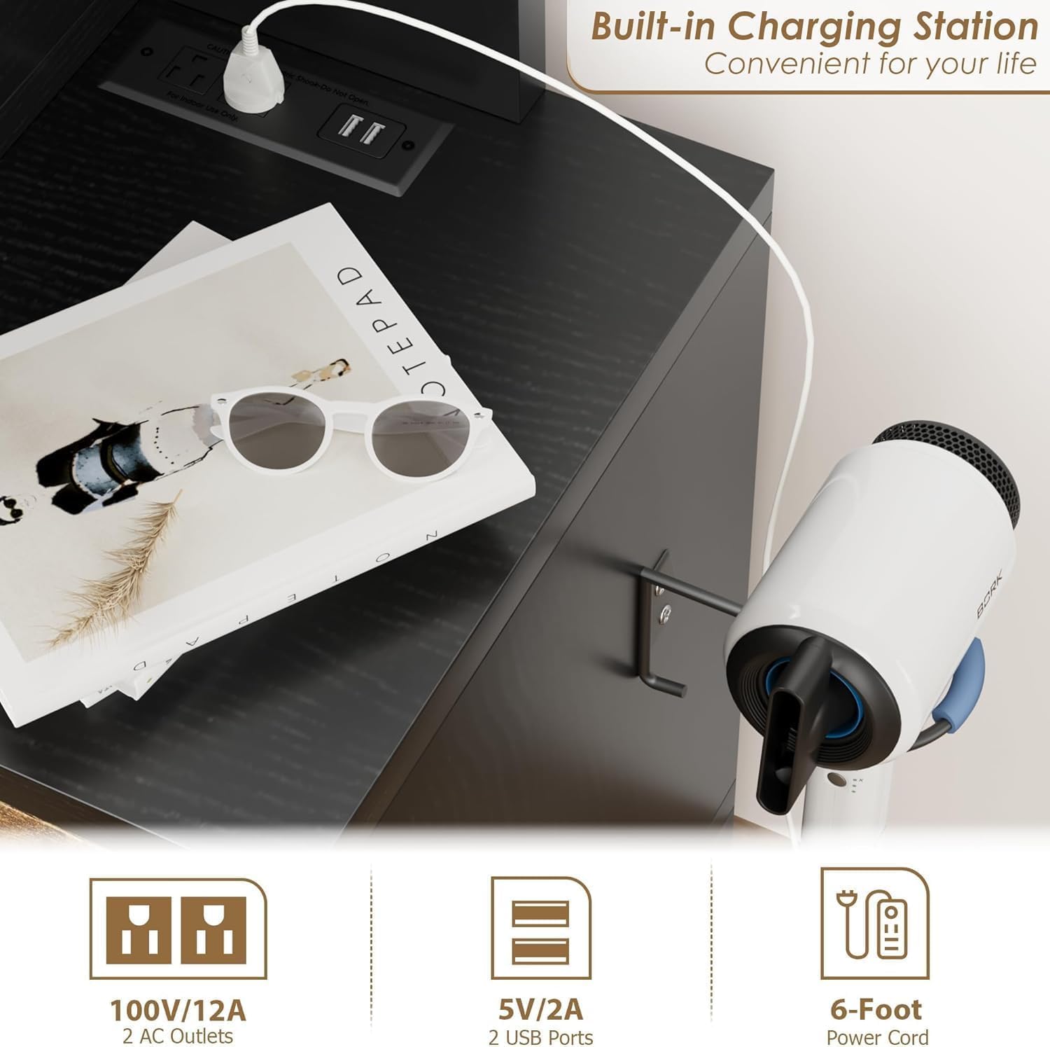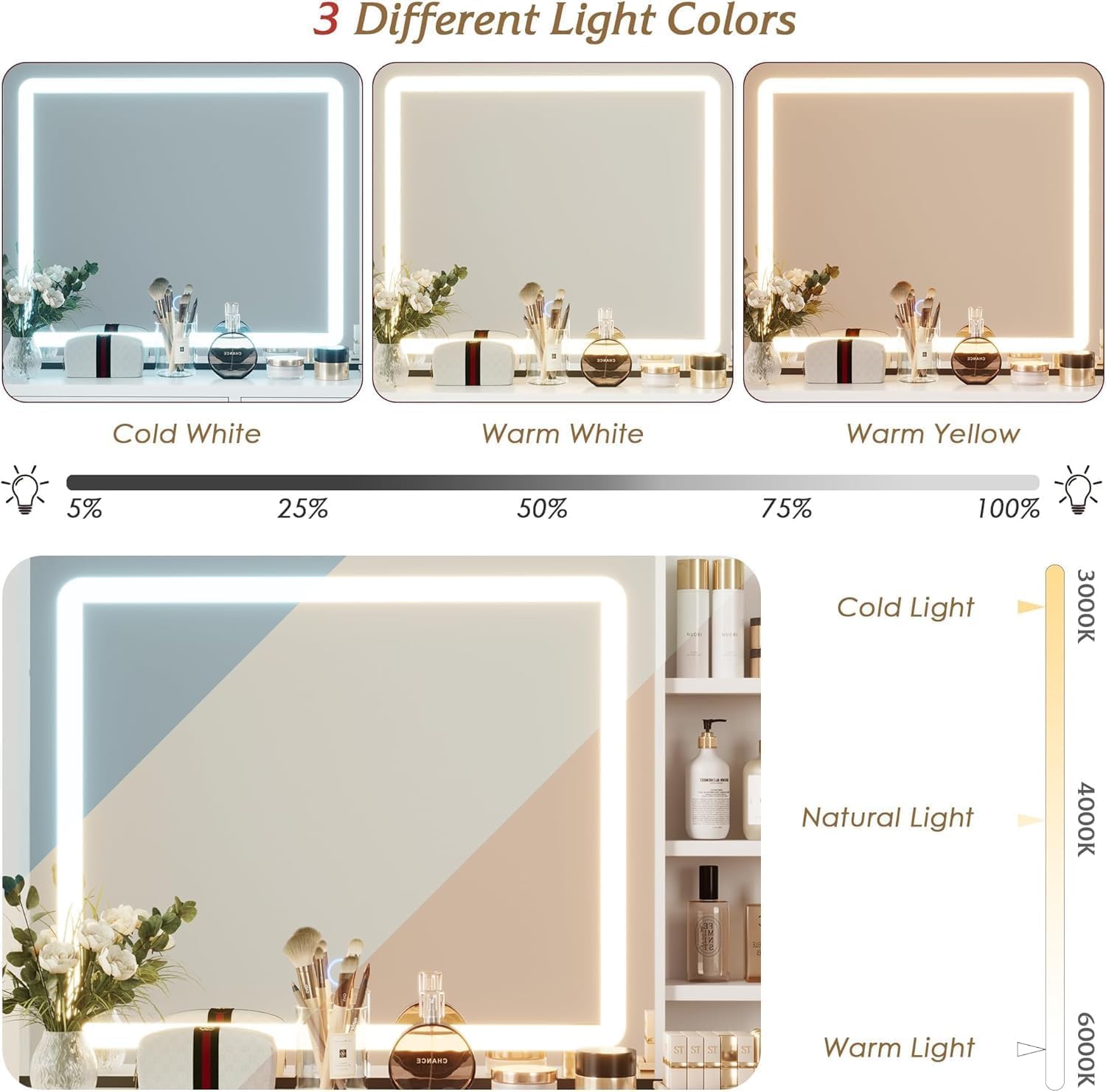 - ✨ Customizable LED Lighting & Charging Station: Easily adjust the 3 color modes and brightness levels on the expansive mirror with just a touch, while the makeup vanity desk, complete with a mirror and lights, features a power hub above the 3-drawer cabinet that includes 2 USB ports and 2 sockets for convenient device charging. Sit comfortably at the table to effortlessly style your hair with your preferred tools.