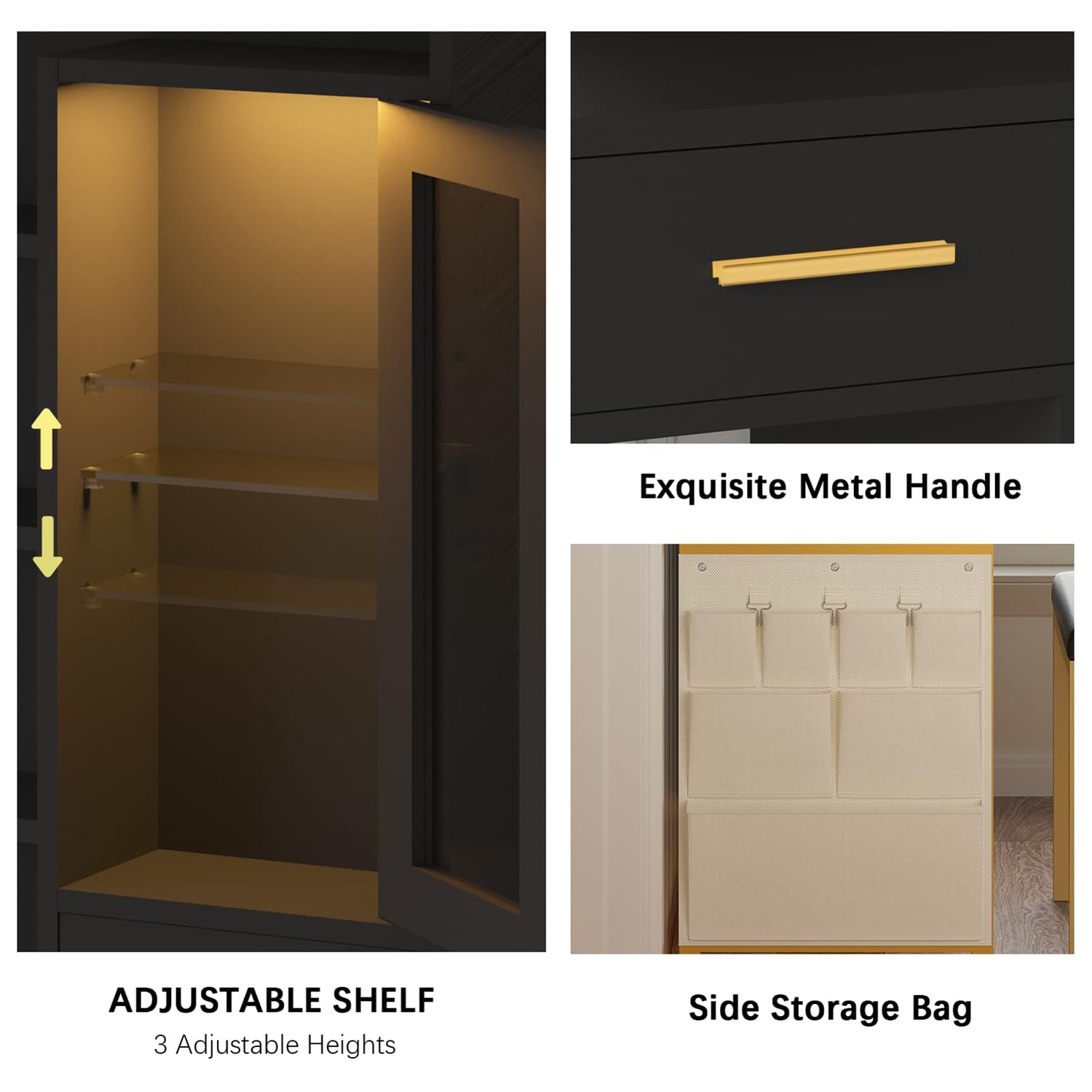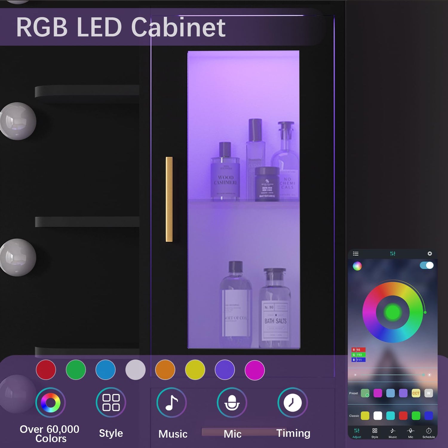 - 【Vanity Desk with RGB LED Light】This vanity is equipped with a cabinet with height-adjustable laminates and an RGB lighting system, which can be controlled via APP or a switch. With over 60,000 static colors available and multiple lighting modes, the system can synchronize to music for a stunning visual experience while you relax or entertain.