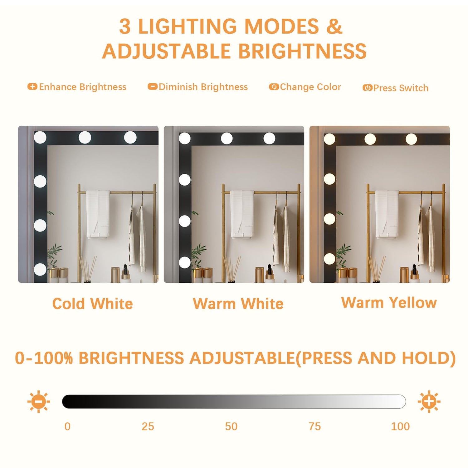 - 【3 Lighting Modes & Brightness Adjustable】The vanity desk is equipped with a large mirror and 10 LED light bulbs, offering 3 color modes (warm yellow, warm white, and cool white) to provide a soft, eye-friendly light source. By simply pressing the switch, you can easily change the color mode or adjust the brightness to your liking.