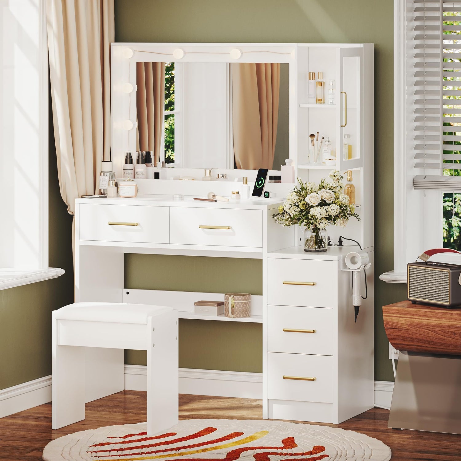 Makeup Vanity with Lights & Charging Station, White Vanity Table with 5 Drawers & Open Storage Shelves, Vanity Desk with Mirror & Lights, Dressing Table Set for Women Girls, Bedroom Makeup Table Set