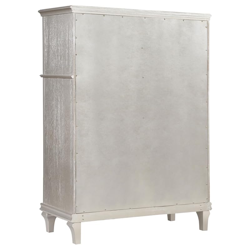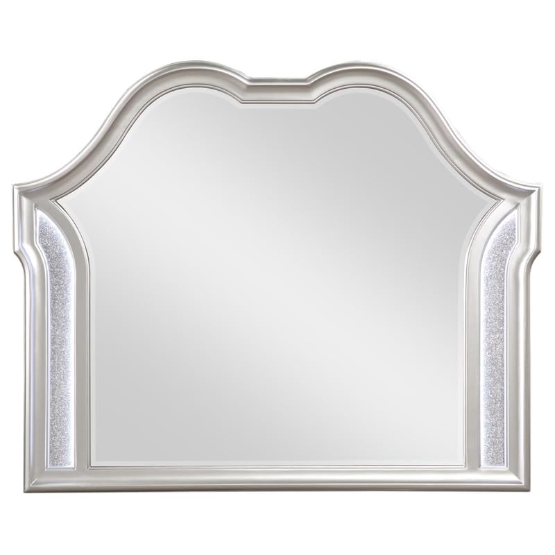 Details: This elegant, glam bedroom set boasts a beautiful double arch platform bed and matching three-drawer nightstand, nine-drawer dresser, vanity mirror, and five-drawer chest to create your breathtaking bedroom retreat. Padded inserts with curved channel tufting upholstered in a soft, ivory fabric adorn the headboard and footboard of the bed, as glittering accent panels offer a luxurious touch throughout the gleaming silver oak finish. The dresser, nightstand, and chest offer ample storage with spacious drawers, each fastened with hexagonal-shaped knobs and bail drop pulls that make it easy to grab items. Soft gray felt-lined top drawers and a USB port on the nightstand offer modern conveniences. A smooth beveled mirror with a double arch frame that reflects the bed silhouette offers a finishing touch and brings this sophisticated glam bedroom set together.