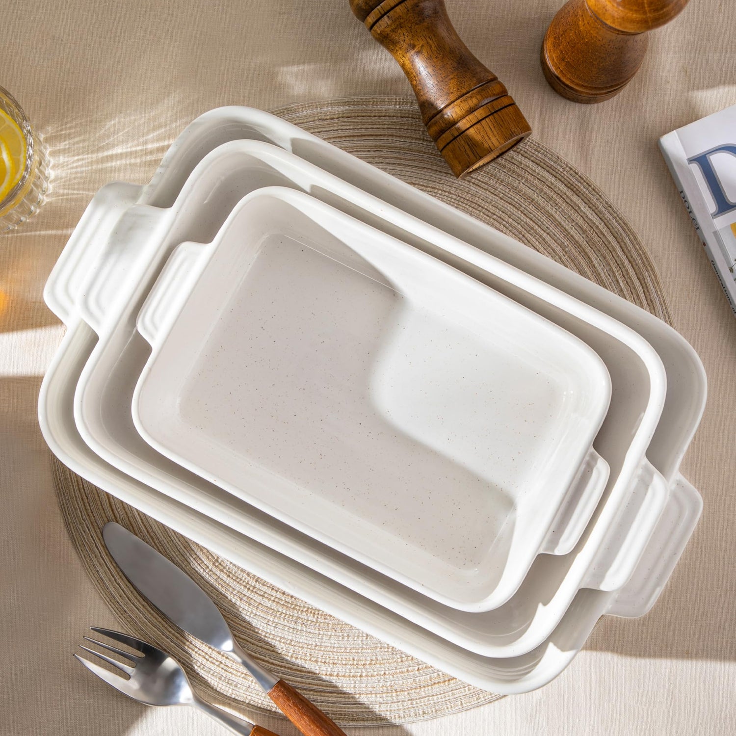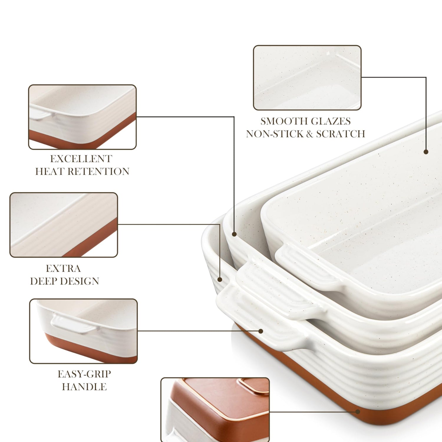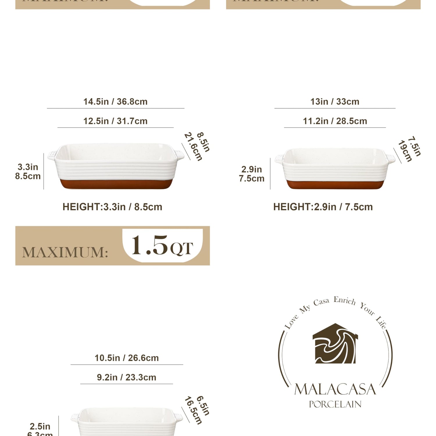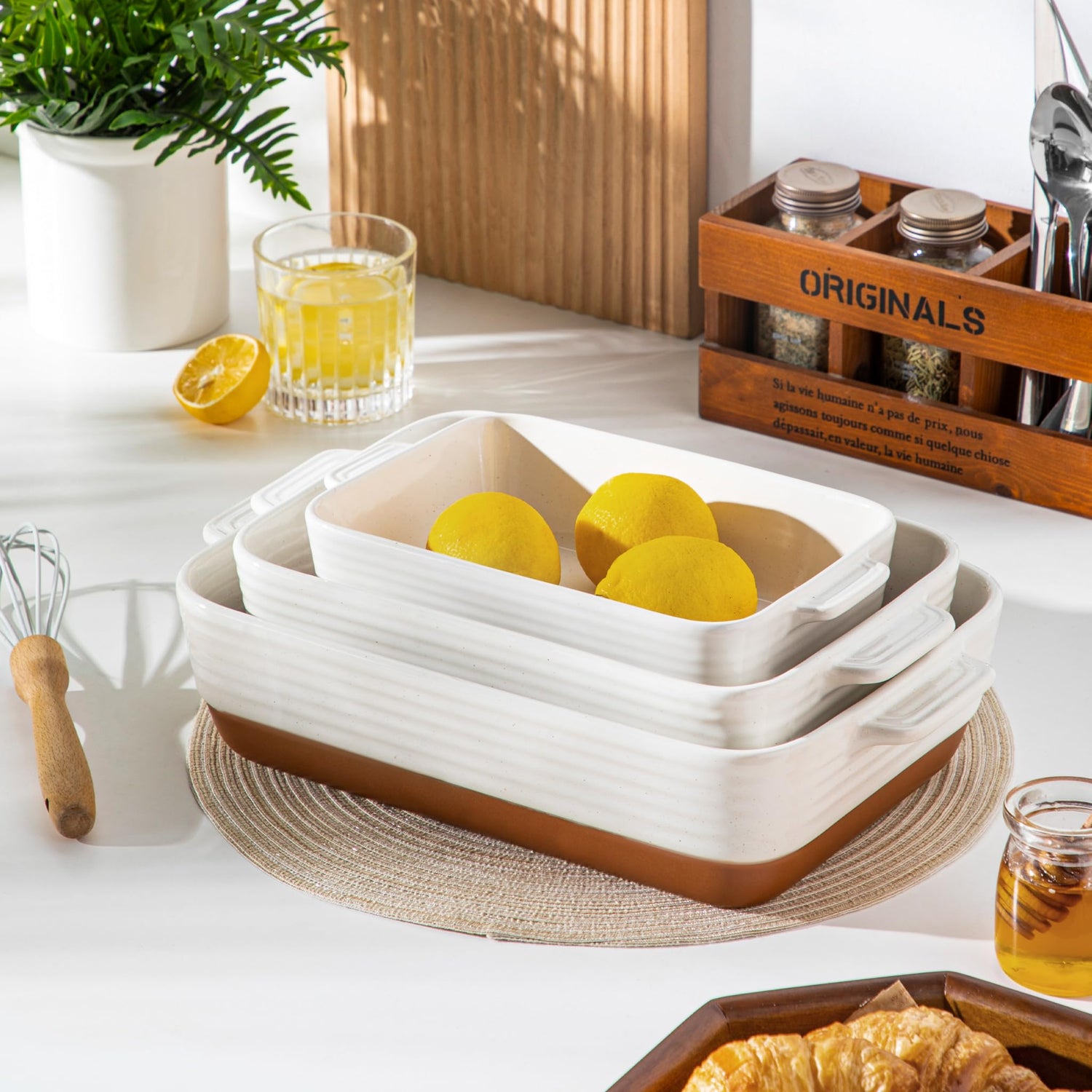 MALACASA Casserole Dishes for Oven, Ceramic Baking Dishes Set of 3, Baking Pan Casserole Dish Set, Rectangular Lasagna Pan Deep with Handles for Baking, Khaki White (14.5''/13''/10.5''), Series TARA