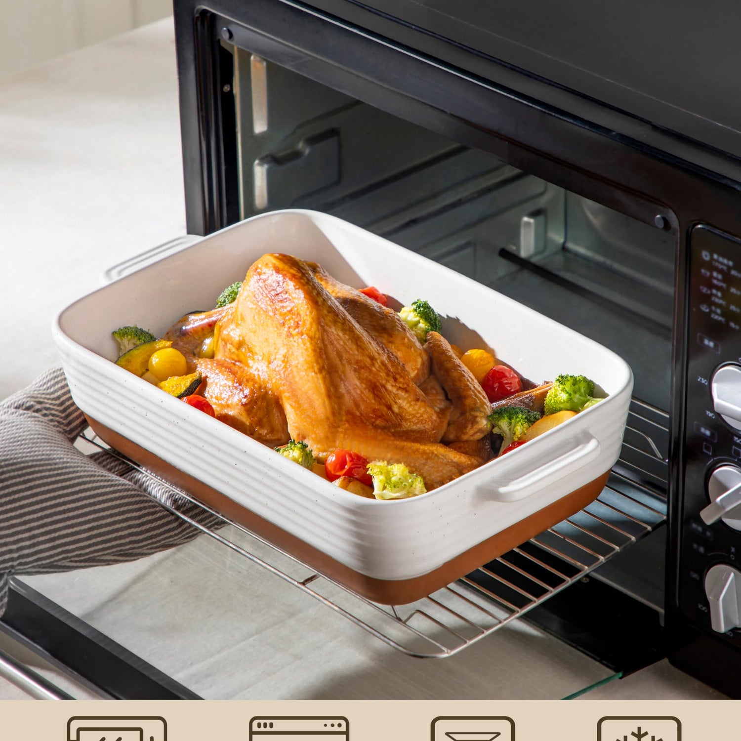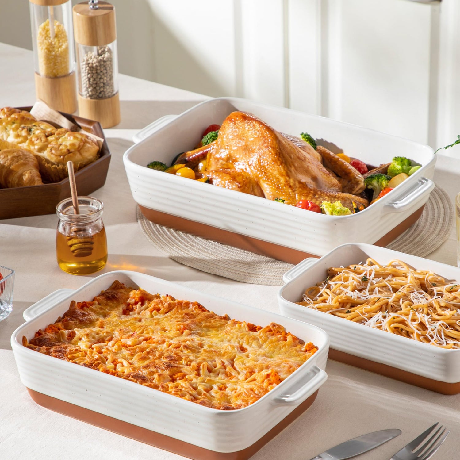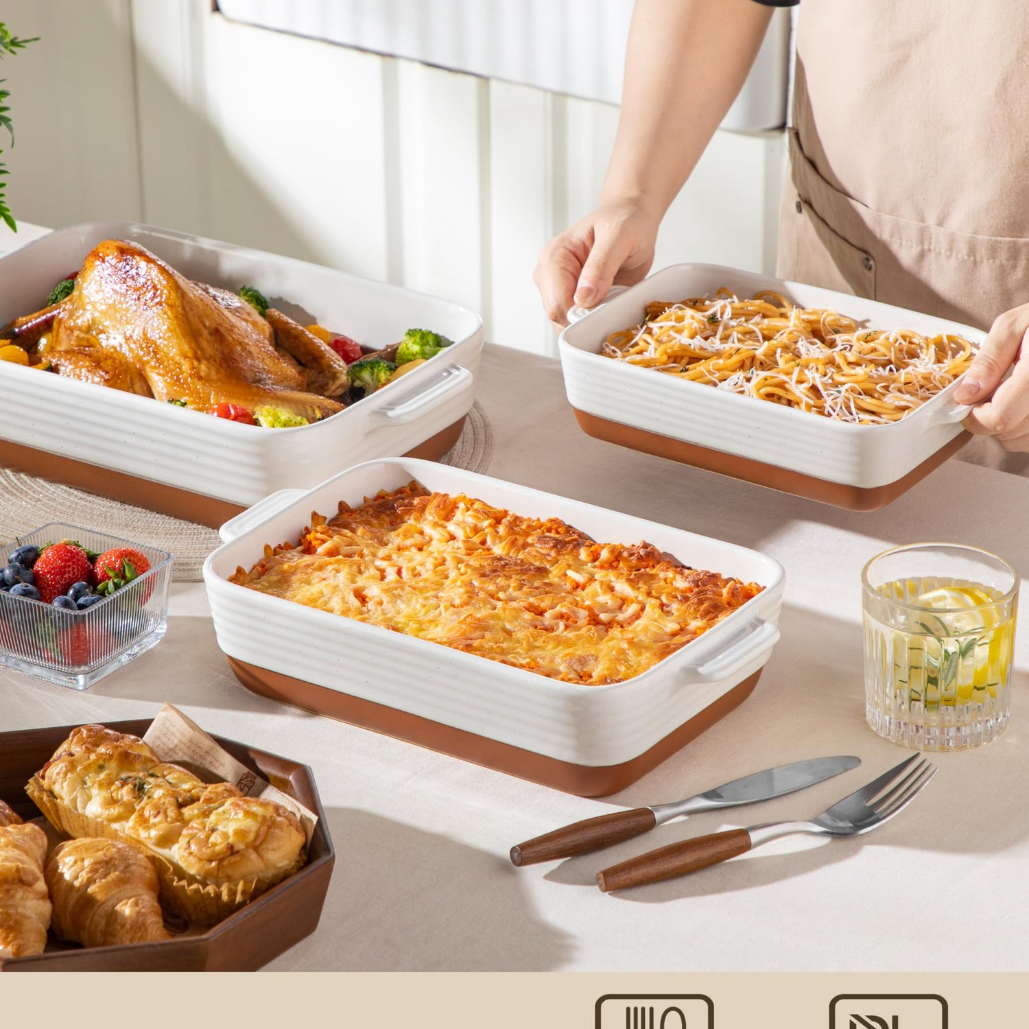 - 【EASY TO CLEAN & GIFTABLE】Interior and exterior smooth glaze and textured bottom surface protect baking pans against stains, making them easy to clean by dishwasher or hand. This ceramic bakeware set is perfect as a gift for your friends and family on Housewarming, Birthday, Wedding parties, Mothers' Day, Fathers' Day, Christmas, Valentine's Day and New Year's Day.