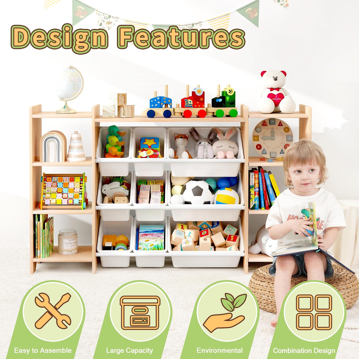 - LARGE STORAGE SPACE - The children's toy storage cabinet has 9 plastic toy storage bins and 3 storage ports.Besides, the topmost wooden board can still be used to store items.Such an extra large storage space allows children to place more things they like, keeping the room clean and tidy, so that children can develop good habits from an early age.