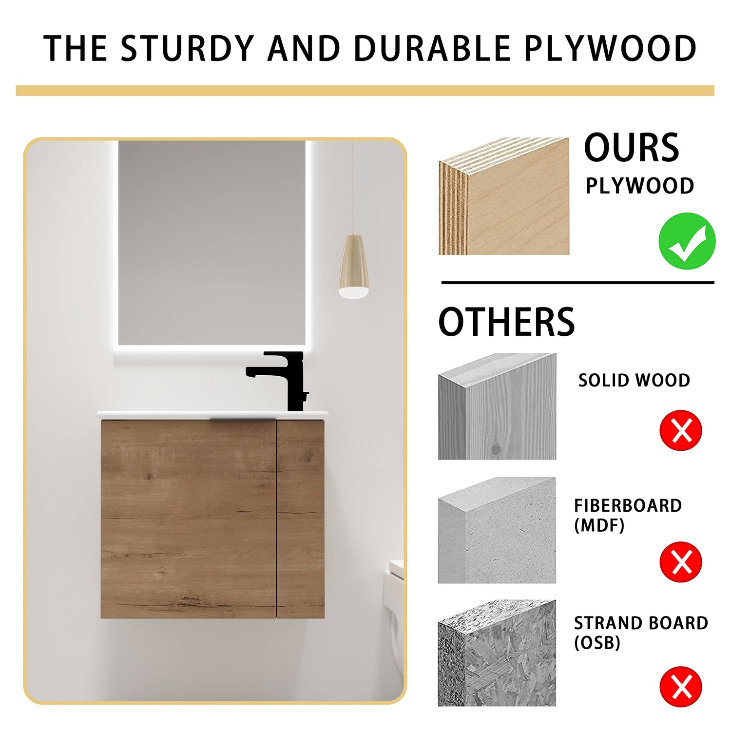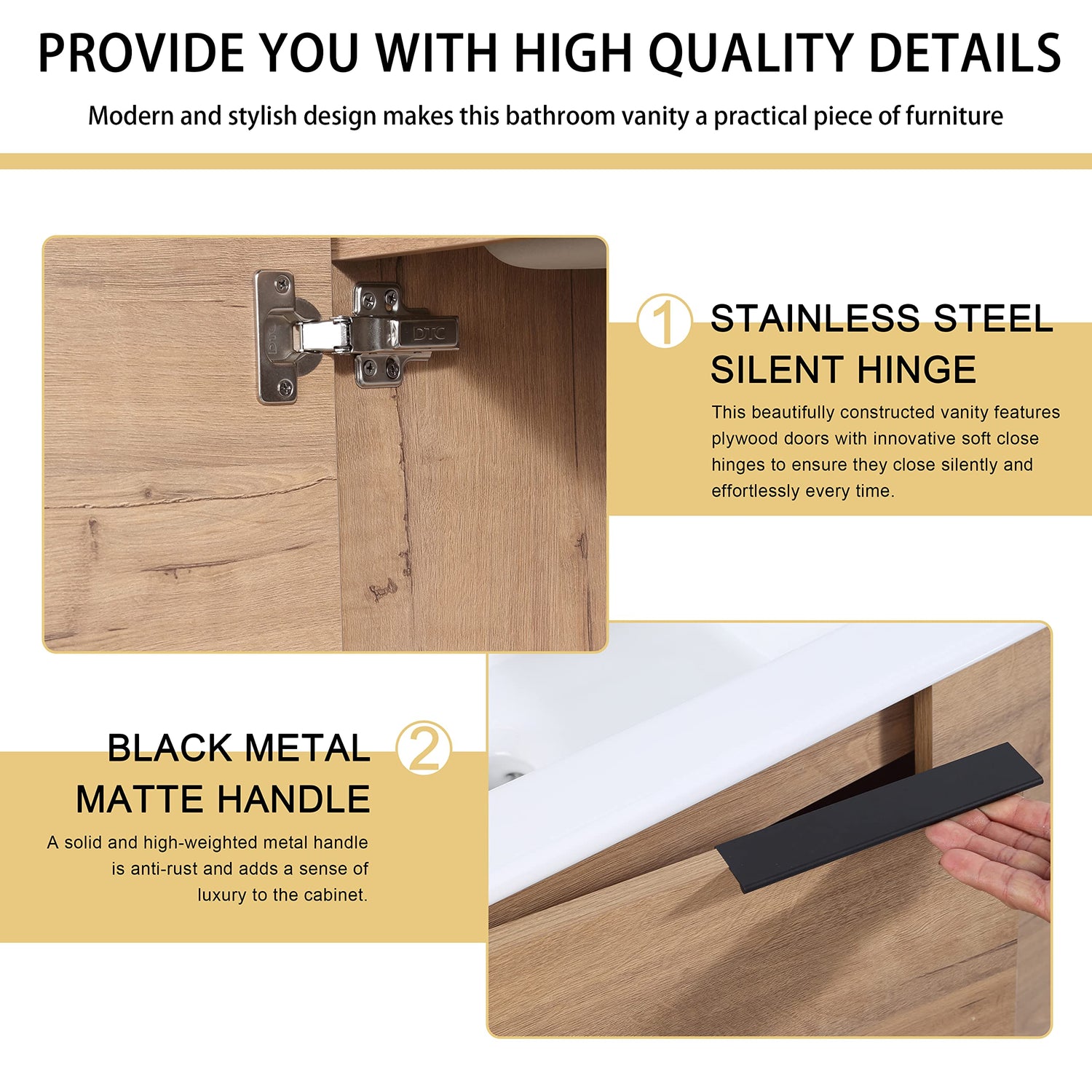 - ⭐【High-Quality Craftsmanship】 Bathroom vanity base is made of high quality "Eco-Friendly" plywood that surface material used "Scratch & Water-Resistant" melamine, which is designed to not only withstand threats of moisture and humidity but also easy to clean and maintain.