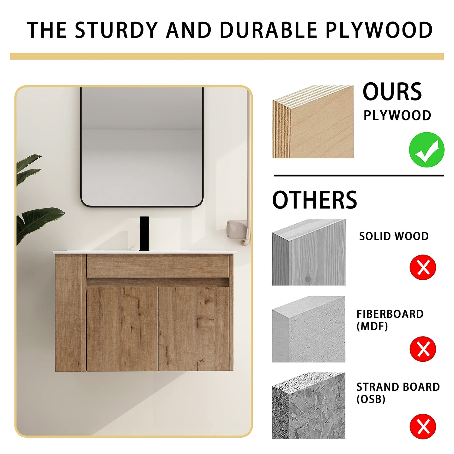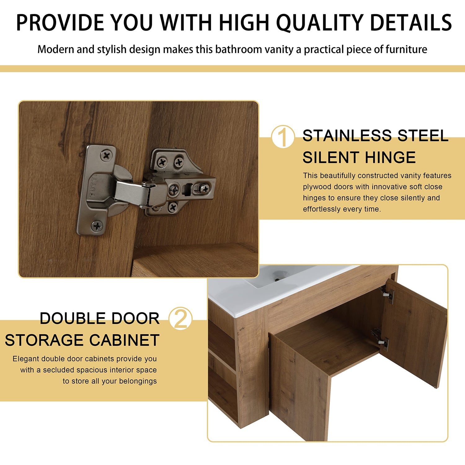 - 🔸 [High-Quality Craftsmanship] Bathroom vanity base is made of high quality "Eco-Friendly" plywood that surface material used "Scratch & Water-Resistant" melamine, which is designed to not only withstand threats of moisture and humidity but also easy to clean and maintain.