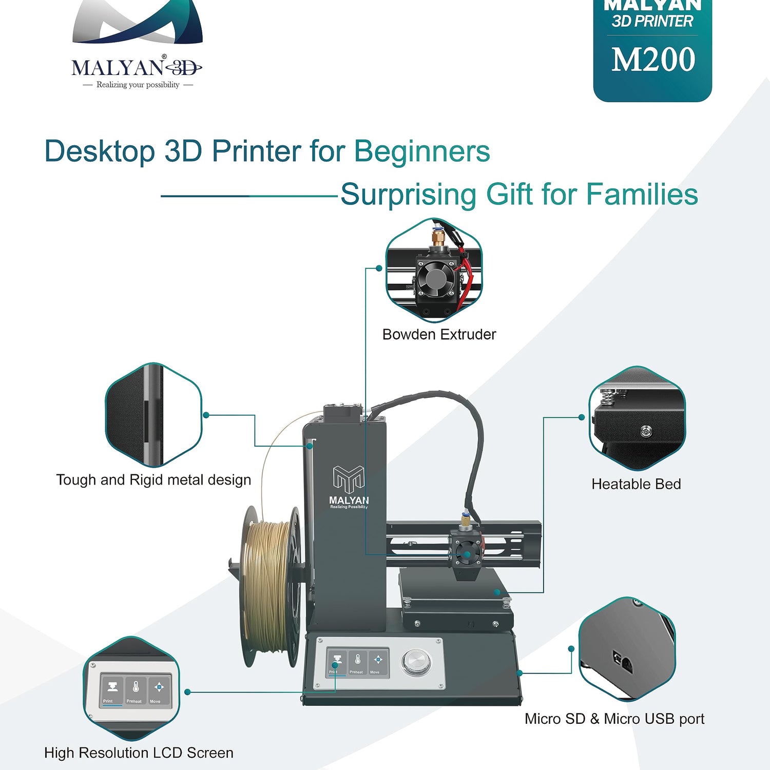 - 【Compact Desktop Design】MALYAN M200 FDM mini 3D printer has a compact desktop design that makes it easy to fit on any desk or workspace. It has a small footprint and an open frame that allows you to monitor the printing process and access the printed objects easily. The metal base and side filament holder make it stable and convenient to use and change the filament.