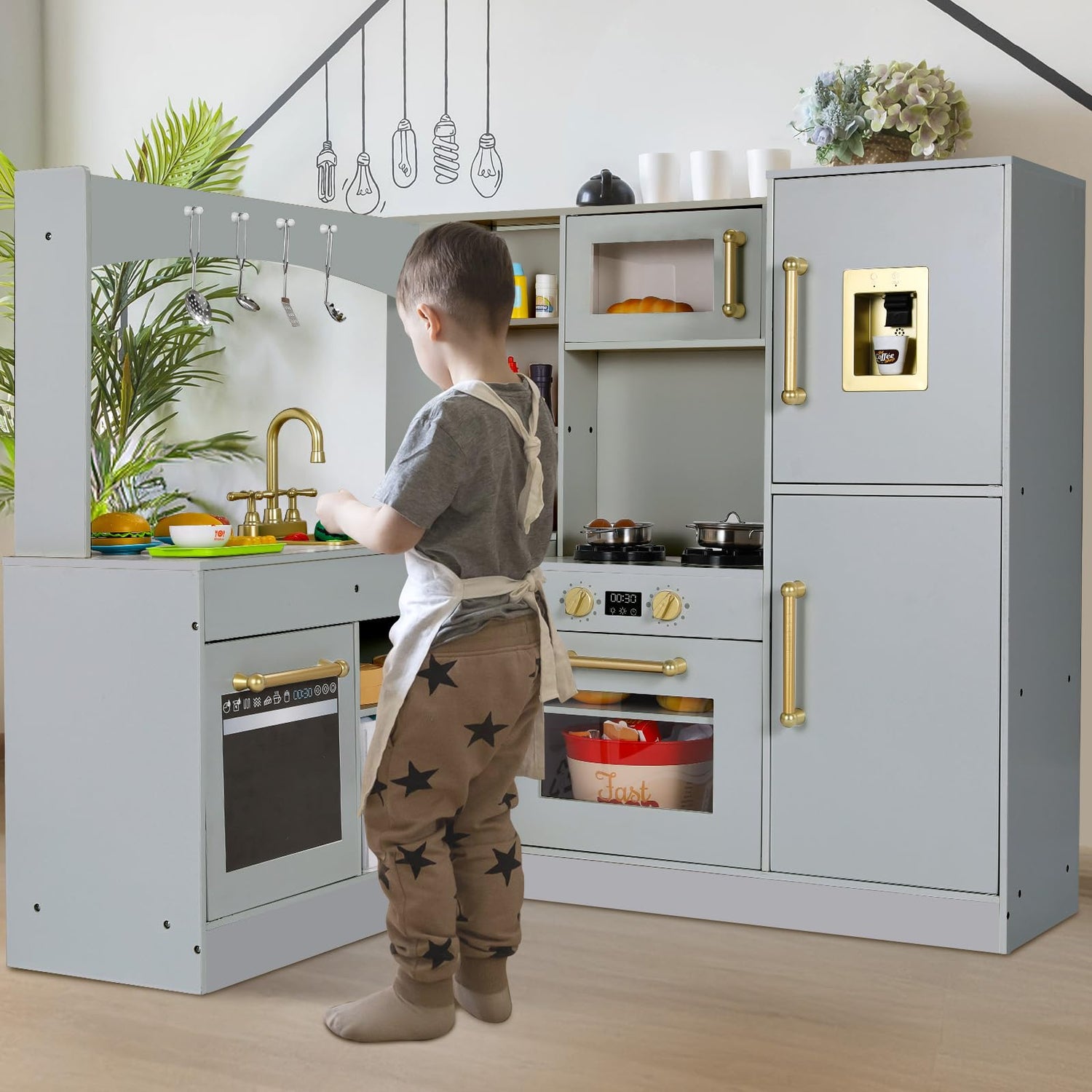 MAMIZO Corner Play Kitchen for Kids, Wooden Pretend Toy Kitchen, Large Toodler Cooking Playset w/Refrigerator, Stove w/Light & Sound, Disinfection Locker, Water Dispenser, Sink, Home Modern (Gray)