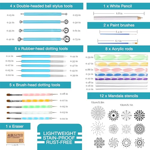 Details: Mandala relieves bad mood, anxiety, calms the mind, teaches to live in the moment and activates inner energy. You can make mandala artwork with your children and enjoy the good parent-child time. This mandala dotting art set can reveal your hidden creativity and make you create unique handmade crafts.  This is an ideal starter set with all your needs to make a mandala work. Not only the dotting tools and stencils but also 12 colors of paint, cardboard, gemstone stickers and easel to decorate your room. No experience or practice is needed to use the tools or to create mandala designs. Fit for both professional and home use. Simply wipe with a paper towel or a damp cloth, after each use This Dotting Mandala Set is a special gift with an exquisite packaging and a creative gift for family members, friends, teens, classmates and teachers as birthday, Christmas, wedding, Thanksgiving, Valentine's Day or anniversary gift    Feature: Ideal for making dots, blending seams in clay, painting on rocks Perfect home or office decor Lightweight allows you to paint dots for hours without getting tired Great for family night, friends meeting, teens activity Easy to handle comes with a waterproof bag   Includes 12 mandala stencil templates 5.1"x5.1" 4 double-headed, rubber handle ball stylus tools  5 dotting tools with rubber head 5 dotting tools with brush head 4 black cardboard 5.9” 8 acrylic rods 2 sheet of 3-color diamond stickers 2.7”x2.7” 1 white pencil 6.8” 1 white paint tray 6.6" 1 mini easel 6.5"x3.5" 1 eraser 1 sponge 3" 2 paint brushes 6.7", 6.4" 2 set of 6 color acrylic paint (12x0.1 oz) 1 storage bag 9.5"x7" 1 gift box 7.5"x7"