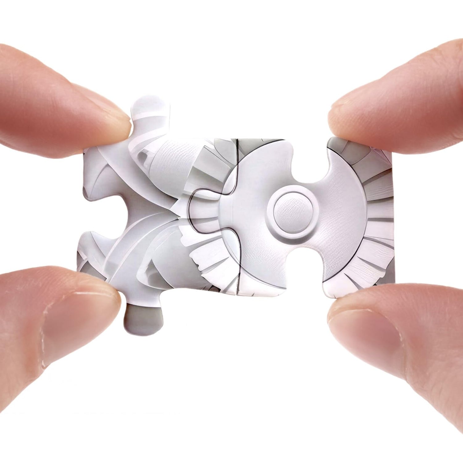 - Elegant Blooming Puzzle: A white flower with layers of delicate petals, centered by a large one surrounded by smaller ones, exudes elegance and symmetry against a light gray backdrop
